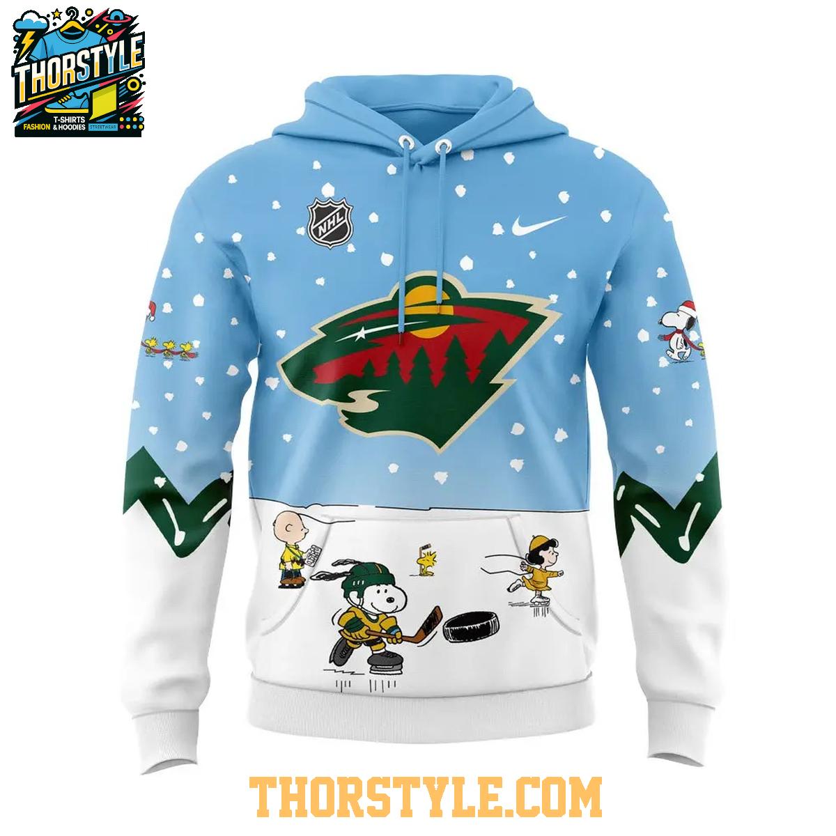 Perfect for casual outings, game days, or festive gatherings, this hoodie t-shirt allows you to express your unwavering support for the Minnesota Wild while embracing the heartwarming spirit of the Peanuts comic strip. The cheerful design and comfortable fit make it an excellent addition to any fan's collection. It's the ideal way to spread holiday cheer and demonstrate your loyalty to your favorite hockey team in a fun and memorable way.