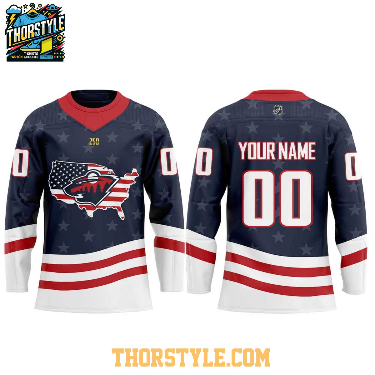 The jersey's design is a striking blend of the Minnesota Wild's iconic imagery and elements inspired by the American flag, creating a visually compelling tribute. Notably, the silhouette of the state of Minnesota is incorporated, filled with the timeless stars and stripes. The bold, vibrant colors ensure you'll stand out in any crowd, whether you're cheering from the stands at the Xcel Energy Center or watching the game from the comfort of your home. Crafted from high-quality, breathable materials, this hockey jersey is engineered for both exceptional comfort and lasting durability.