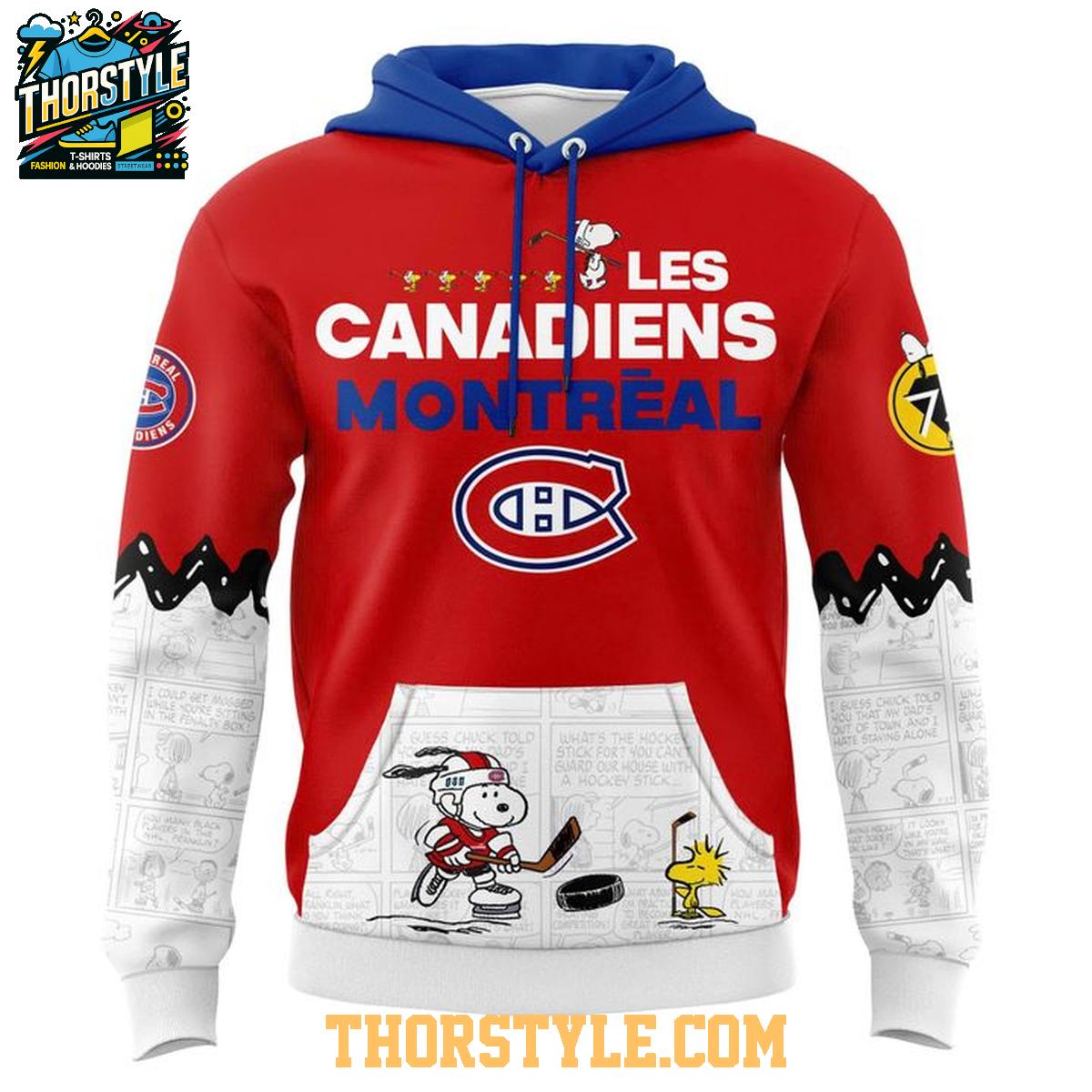 This hoodie t-shirt features vibrant graphics showcasing Snoopy and the Peanuts gang enjoying a Canadiens hockey game. The design incorporates the team's colors and logo, making it a standout piece for game days or casual wear. The playful artwork captures the fun and excitement of hockey season, while the Canadiens branding proudly displays your allegiance.