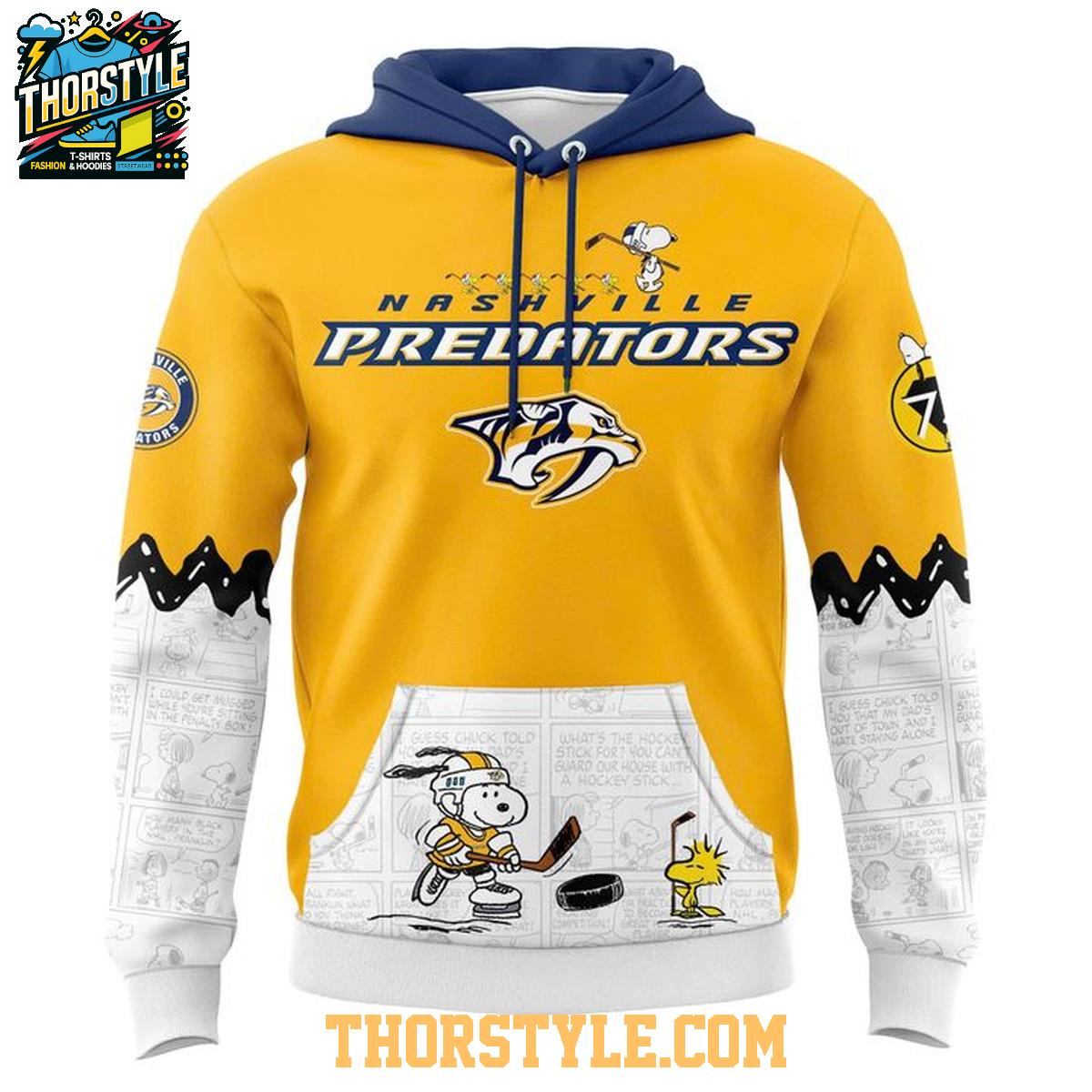 Get ready for a unique collaboration with the Nashville Predators Peanuts Night 2025-2026 Snoopy Hockey Hoodie T-Shirt. This special edition apparel blends the excitement of NHL hockey with the timeless charm of the Peanuts gang, creating a must-have item for fans of all ages. It's the perfect way to show your team spirit and celebrate a special night at Bridgestone Arena.