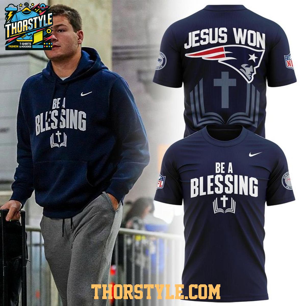 The design features prominent graphics, including "Jesus Won" emblazoned on the back, alongside the iconic Patriots logo. The front showcases a powerful message, "Be A Blessing," making it a conversation starter wherever you go. The potential year "2025" may signify the anticipation of future Patriots' successes, perhaps linked to rising stars, making it a forward-looking piece of fan apparel. The integration of religious symbolism with team spirit creates a distinctive and meaningful design.