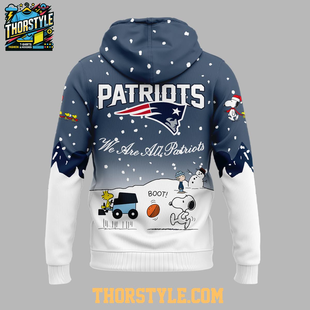 This hoodie t-shirt features a vibrant design that captures the essence of a wintery Patriots game day. You'll find Snoopy sporting a Patriots helmet, ready to make the winning play, alongside other beloved Peanuts characters enjoying the snowy festivities. The iconic "NE" logo is prominently displayed, ensuring everyone knows where your allegiance lies. The clever combination of team colors and Peanuts artwork makes this a real conversation starter.