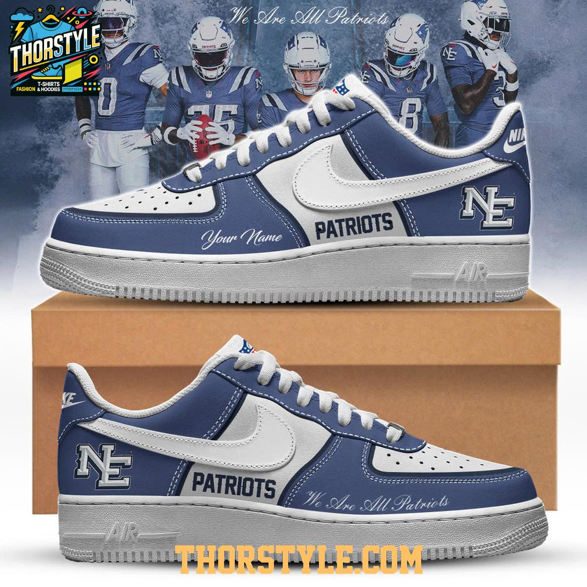 These eye-catching sneakers prominently feature the Patriots' signature team colors, ensuring your allegiance is clear and unmistakable. The word "PATRIOTS" is boldly displayed on the side, complemented by a stylized "NE" logo that further emphasizes your connection to the team. To make these shoes truly unique, you can personalize them with your own name, adding a personal touch that sets them apart from the crowd. The inspiring phrase "We Are All Patriots" is subtly incorporated into the design, serving as a constant reminder of the shared passion that unites the fanbase.