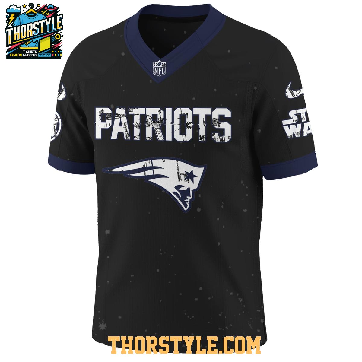 The front of this striking jersey proudly showcases "PATRIOTS" in bold lettering, complemented by the iconic "Flying Elvis" logo and an official NFL shield at the V-neck. Its sleek black base, accented with classic navy blue trim, provides an authentic jersey aesthetic, subtly incorporating "STAR WARS" branding on the sleeve for a truly integrated and sophisticated crossover appeal.