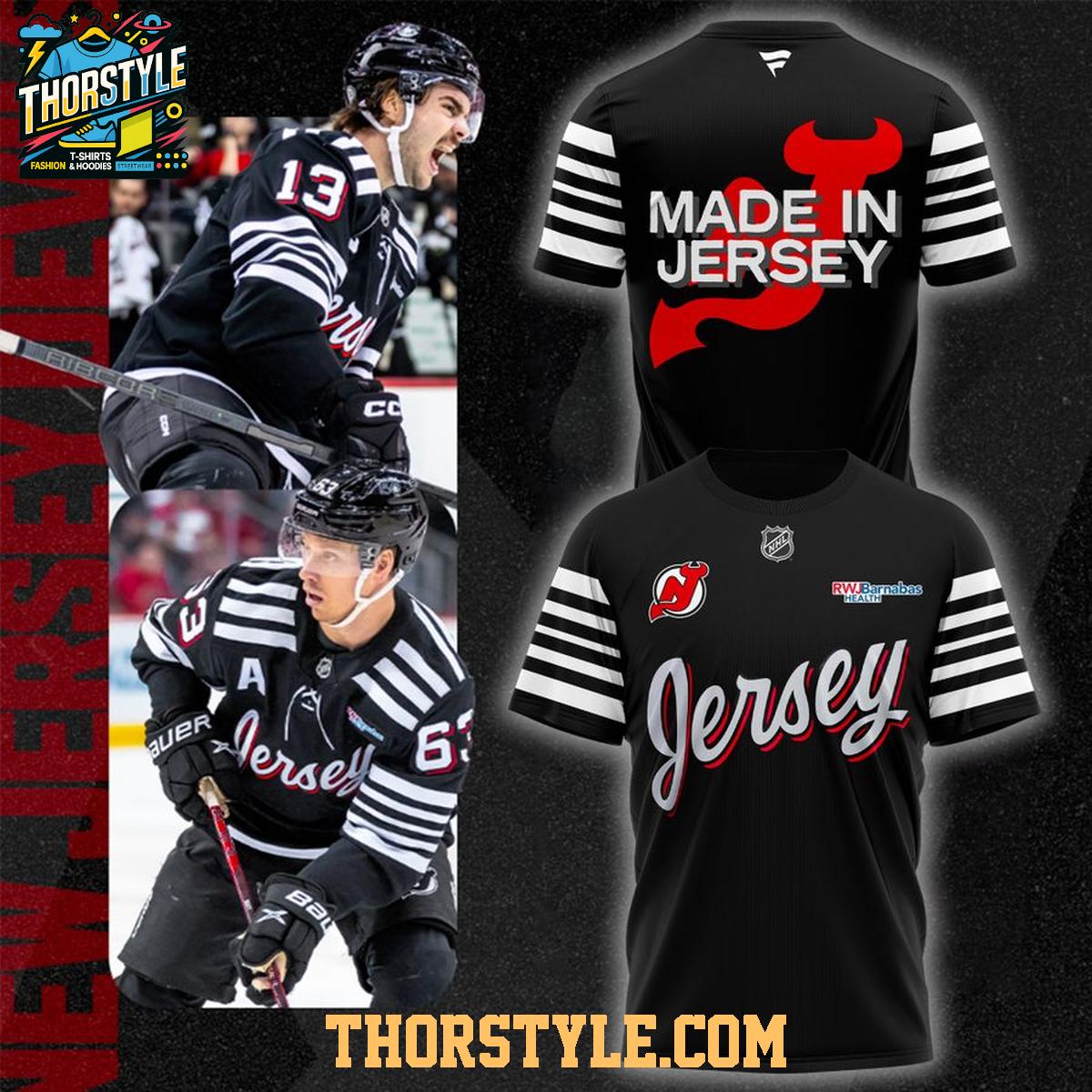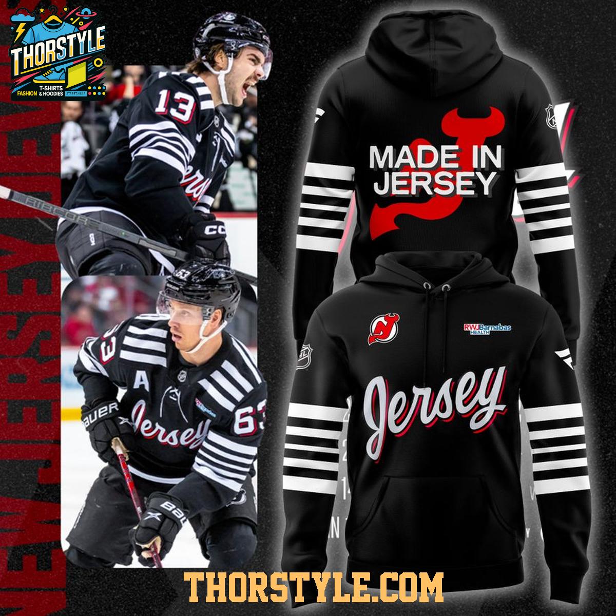This hoodie t-shirt features a striking design that proudly displays "Made In Jersey" on the back, along with the iconic Devils logo. The front showcases a stylish "Jersey" script, further emphasizing the team's connection to its home state. The classic black colorway, accented with the team's signature red and white, ensures it pairs well with jeans, joggers, or even layered under a jacket on colder days.