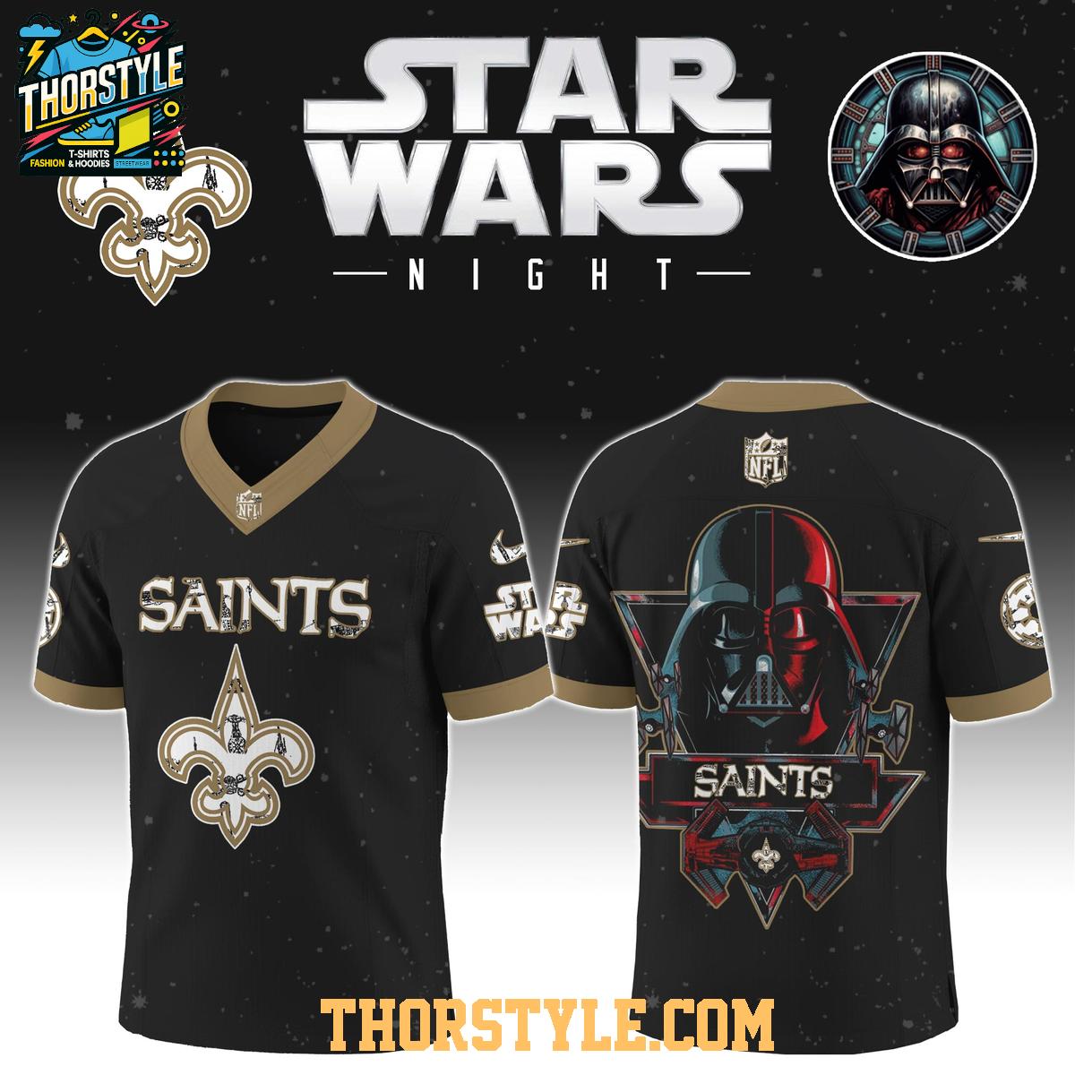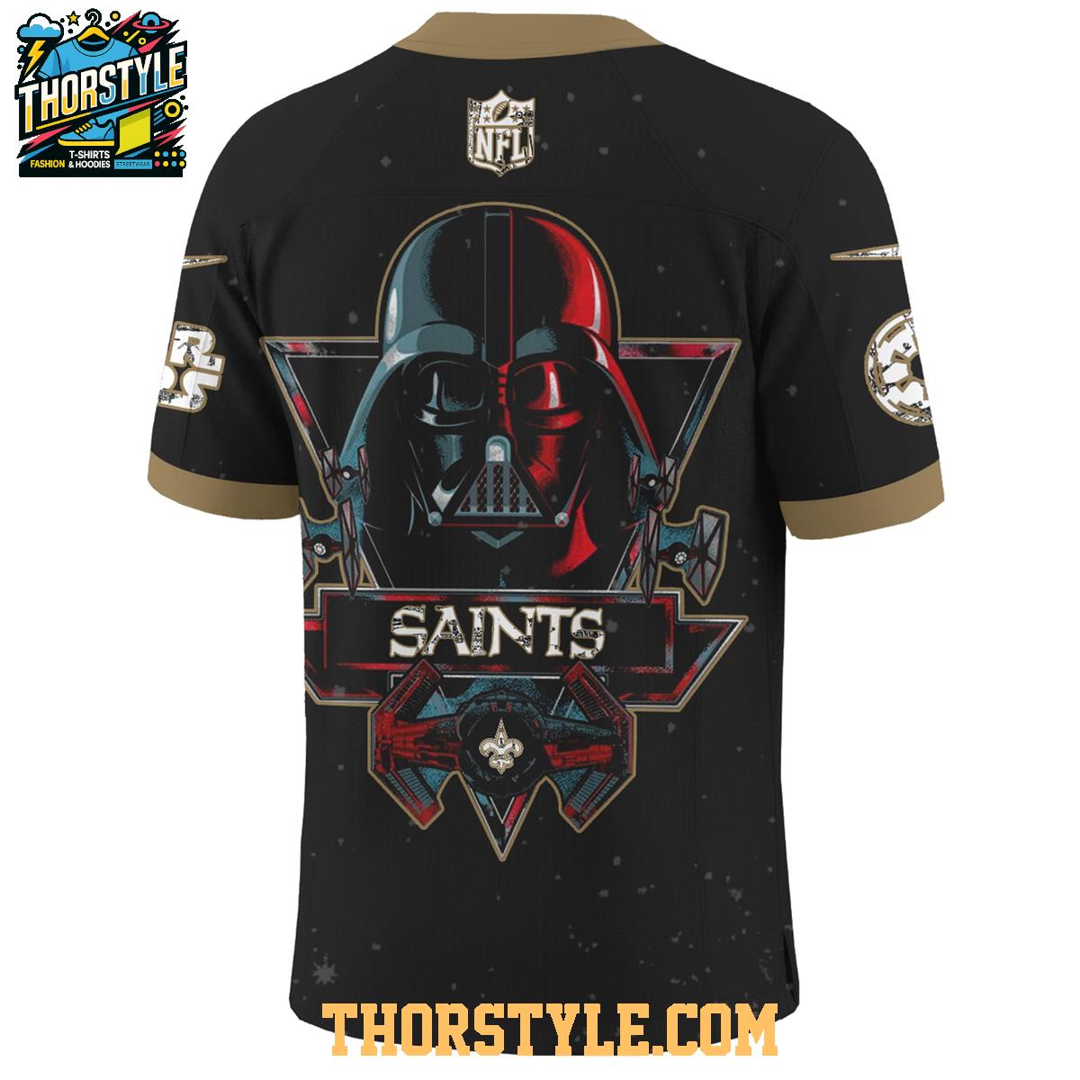Prepare to turn heads with the powerful graphic adorning the back: Darth Vader's helmet rendered in a dynamic split design, powerfully evoking his formidable presence and command. Below this striking imagery, a "SAINTS" banner is boldly displayed, flanked by menacing starfighter elements that complete the epic visual narrative. This intricate detailing transforms the jersey into a true collectible, essential for devoted fans of both the New Orleans Saints and the legendary Star Wars saga.
