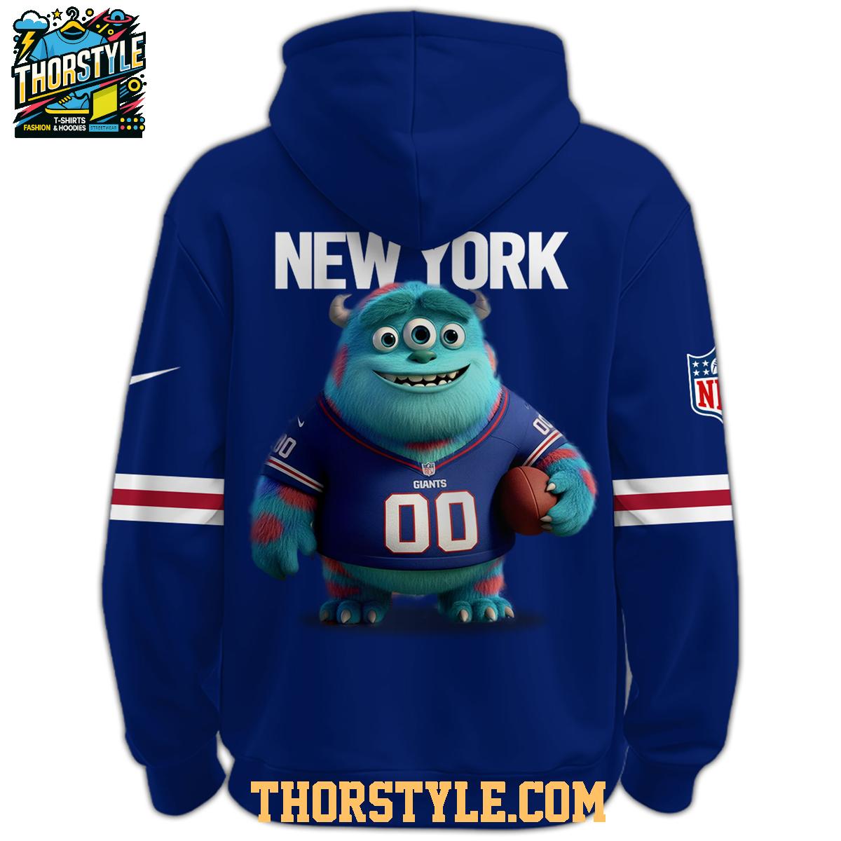 The true magic unfolds on the back, where a playful, full-color graphic features Mike Wazowski from Monsters Inc., impeccably decked out in his own New York Giants jersey, complete with the number "00." Bold "NEW YORK" text arches above this charming crossover illustration, cementing its status as an unmistakable and standout piece. This imaginative detail ensures the hoodie captures attention whether you're at the stadium or enjoying a casual outing.