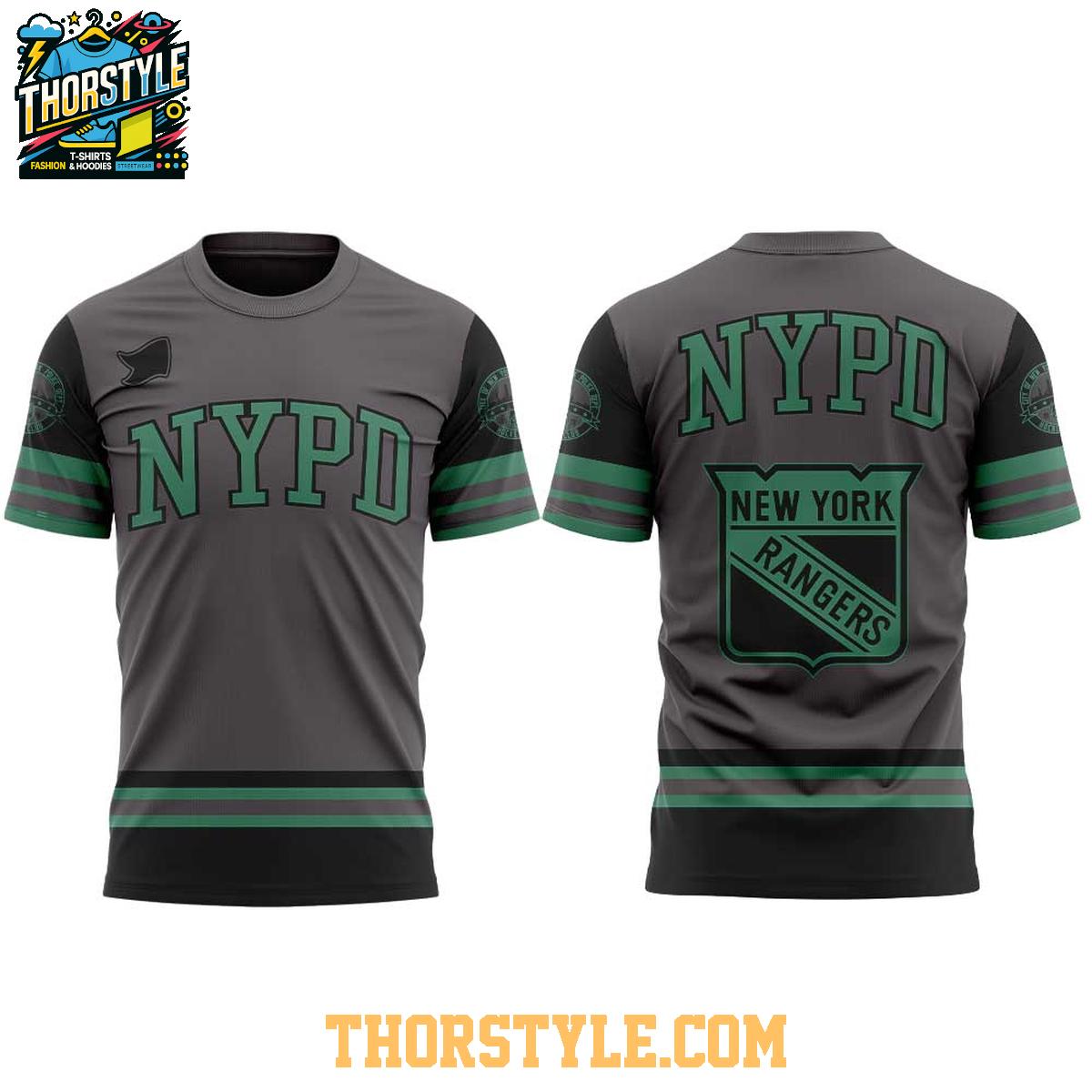 The design features a bold "NYPD" emblem across the chest and back, integrated with the iconic New York Rangers shield. The color scheme blends the Rangers' classic blue with the NYPD's signature colors, creating a visually striking tribute. This hoodie t-shirt is not just apparel; it's a symbol of gratitude and solidarity.