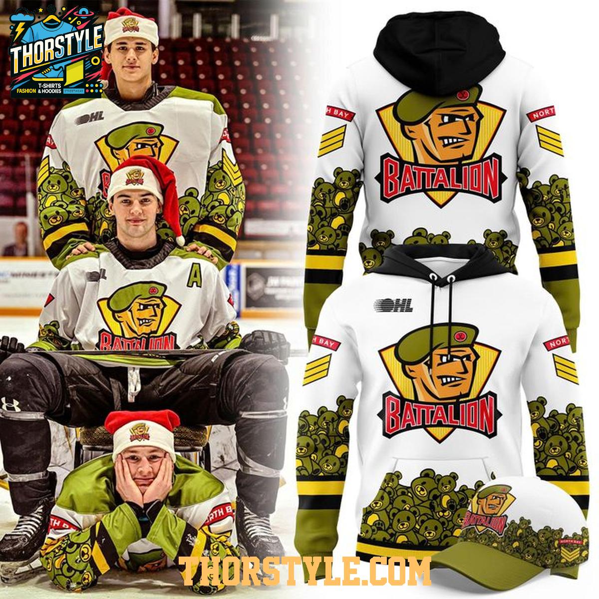 Celebrate a time-honored tradition with the North Bay Battalion Teddy Bear Toss Tradition 2025 Christmas Hoodie T-Shirt. This unique garment blends the festive spirit of the holidays with the excitement of hockey, commemorating the beloved annual event where fans shower the ice with teddy bears after the Battalion’s first goal. It's more than just apparel; it's a wearable piece of North Bay hockey history.