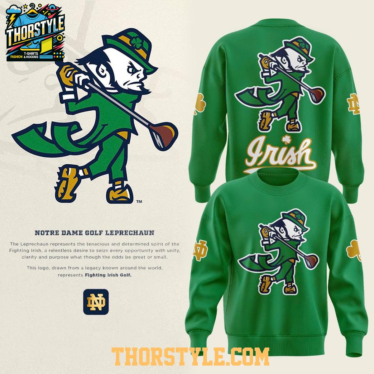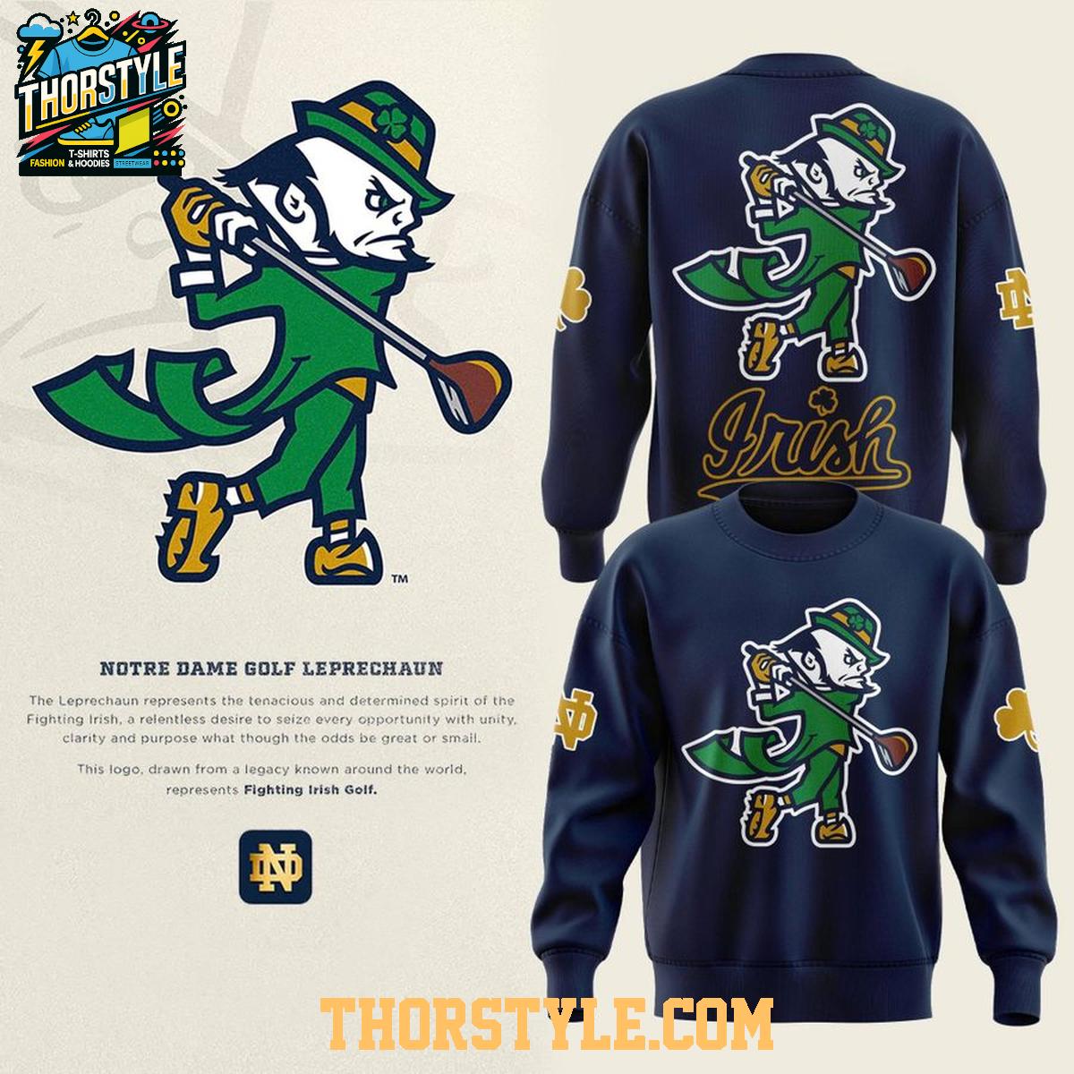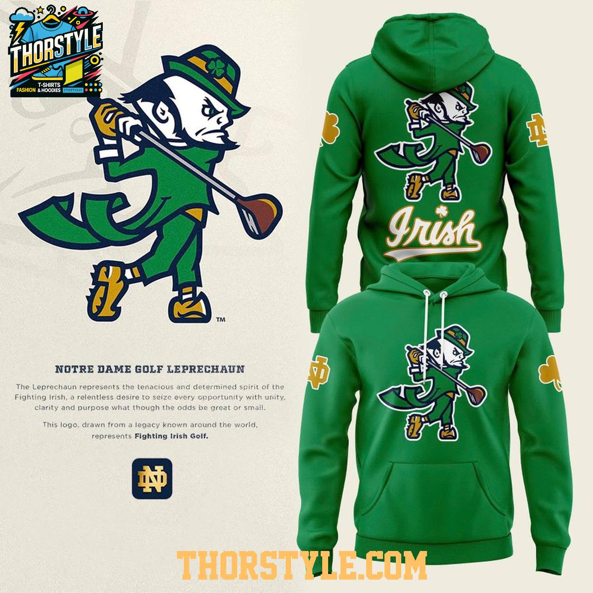 The design features the iconic Notre Dame leprechaun in full golfing action, showcasing your passion for both the university and the sport. The bold graphics are printed with quality inks to ensure they stay vibrant, season after season. This hoodie t-shirt is a great way to demonstrate your support for Notre Dame's golf program as they compete in the 2026 season.
