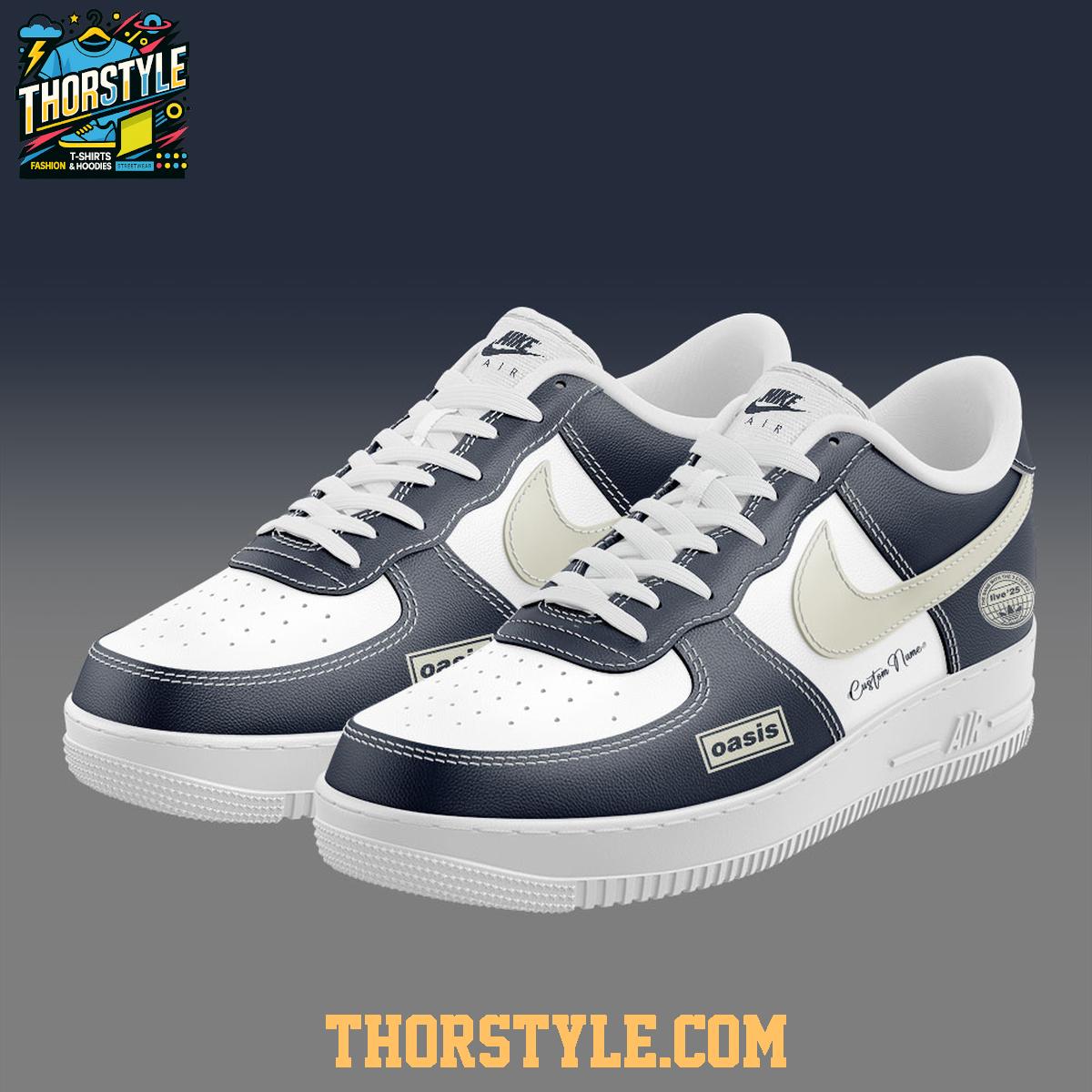 Expertly crafted on the timeless Nike Air Force 1 silhouette, these shoes boast a striking navy and white premium synthetic leather upper, perfectly complemented by a distinctive cream Nike swoosh. The design boldly features the classic "oasis" wordmark and the instantly recognizable "live '25" globe logo on the heel, celebrating the tour's energy and the band's unparalleled legacy with authentic, fan-centric details.