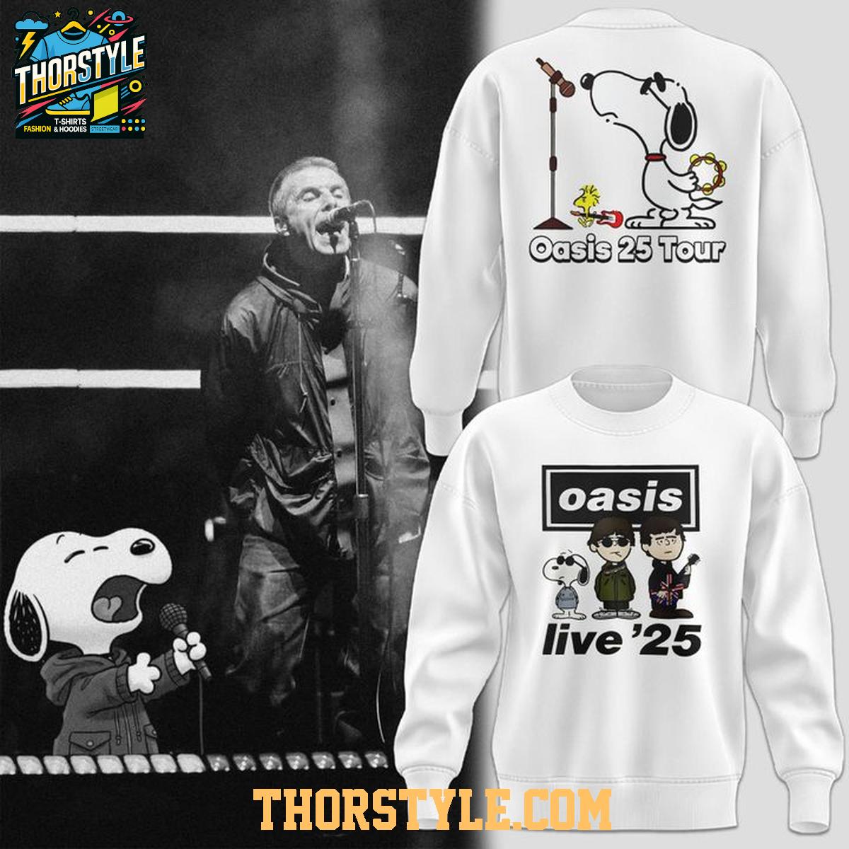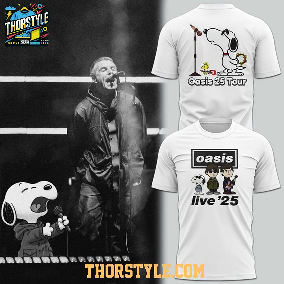 The design features a crisp white backdrop that beautifully showcases Snoopy in a variety of musical poses. One prominent image commemorates the "Oasis 25 Tour," depicting Snoopy confidently taking the microphone. Another captivating design portrays Snoopy alongside cartoon renderings of the Oasis band members, effectively capturing the vibrant energy of "Oasis Live '25." These artistic elements come together to create a visually compelling and memorable piece of clothing.