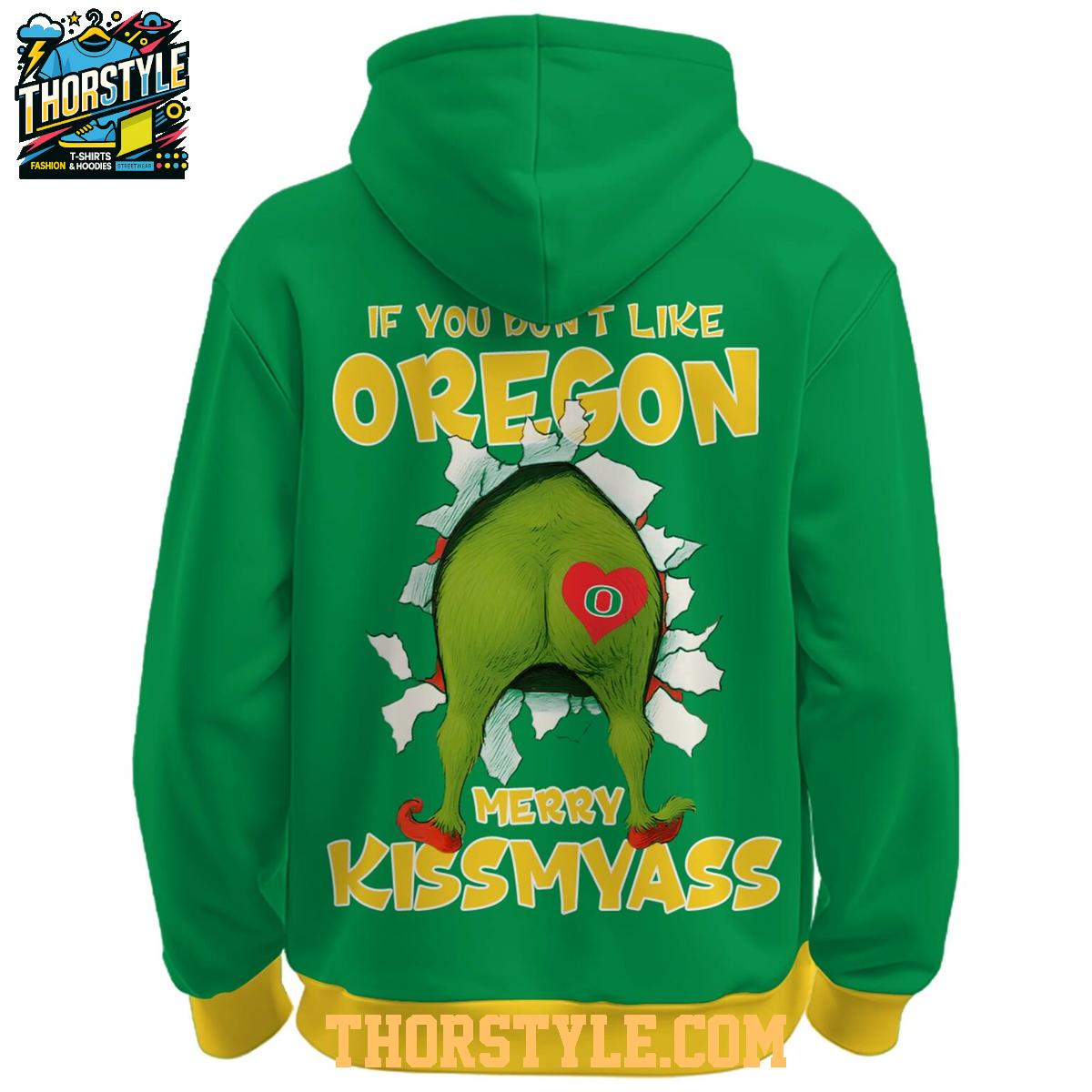 This eye-catching hoodie t-shirt features a vibrant green color scheme, reminiscent of the Grinch himself. The front showcases a festive Grinch sporting an Oregon "O" Santa hat, seemingly bursting through a holiday-themed backdrop, complete with candy canes and holly. Below, the word "DUCKS" proudly proclaims your team allegiance. Turning to the back, you'll find the humorous "If you don't like OREGON..." message above a cheeky Grinch-themed graphic.