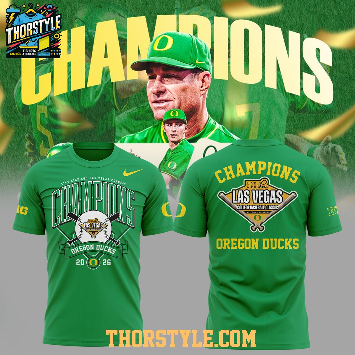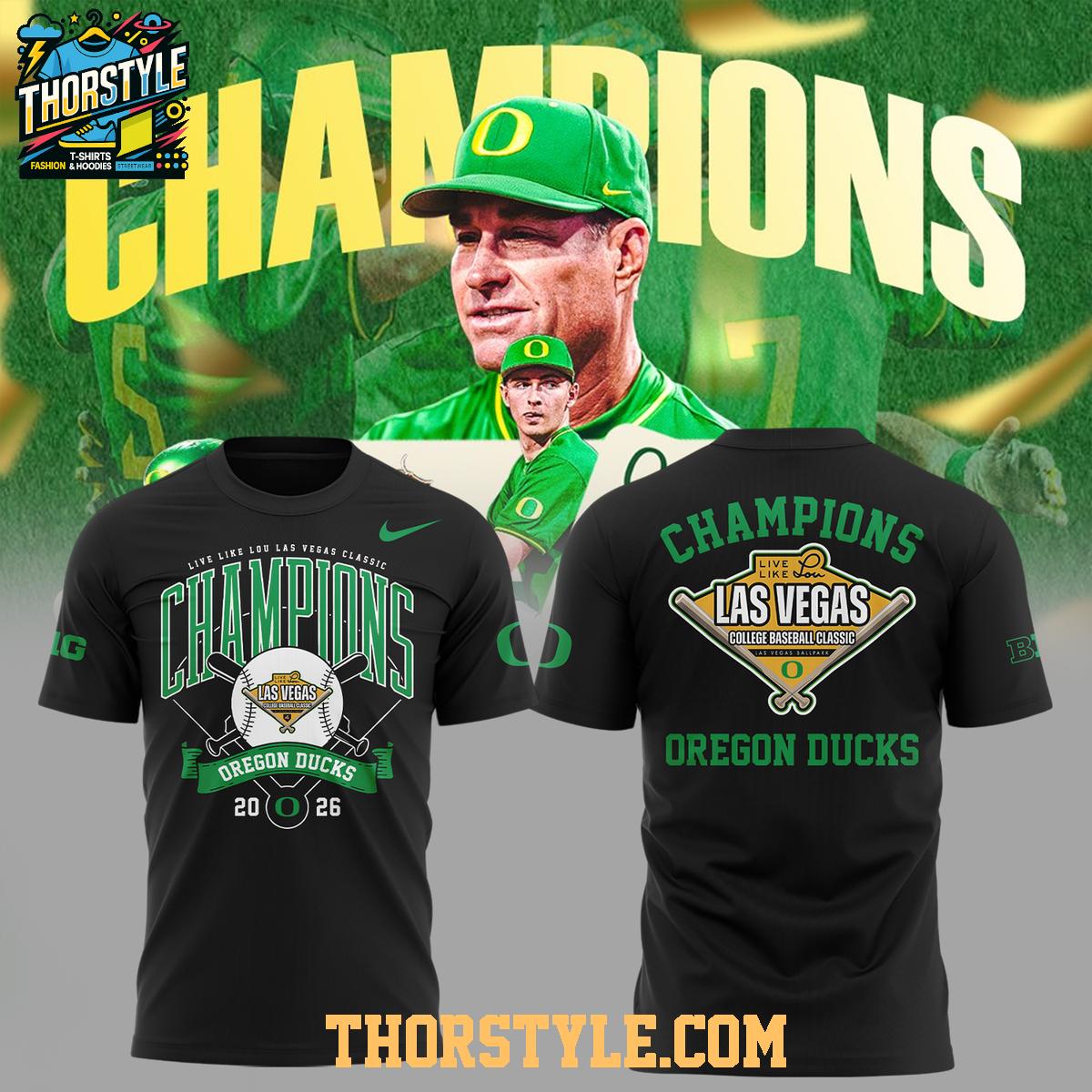 The design features bold graphics celebrating the Oregon Ducks' Las Vegas Classic victory in 2026. The front showcases a prominent "Champions" design with baseball bats and the "Las Vegas" designation, along with the "Oregon Ducks" name and the victorious year. The back echoes this design, ensuring your team pride is visible from all angles. The vibrant team colors and crisp graphics make a statement wherever you go.
