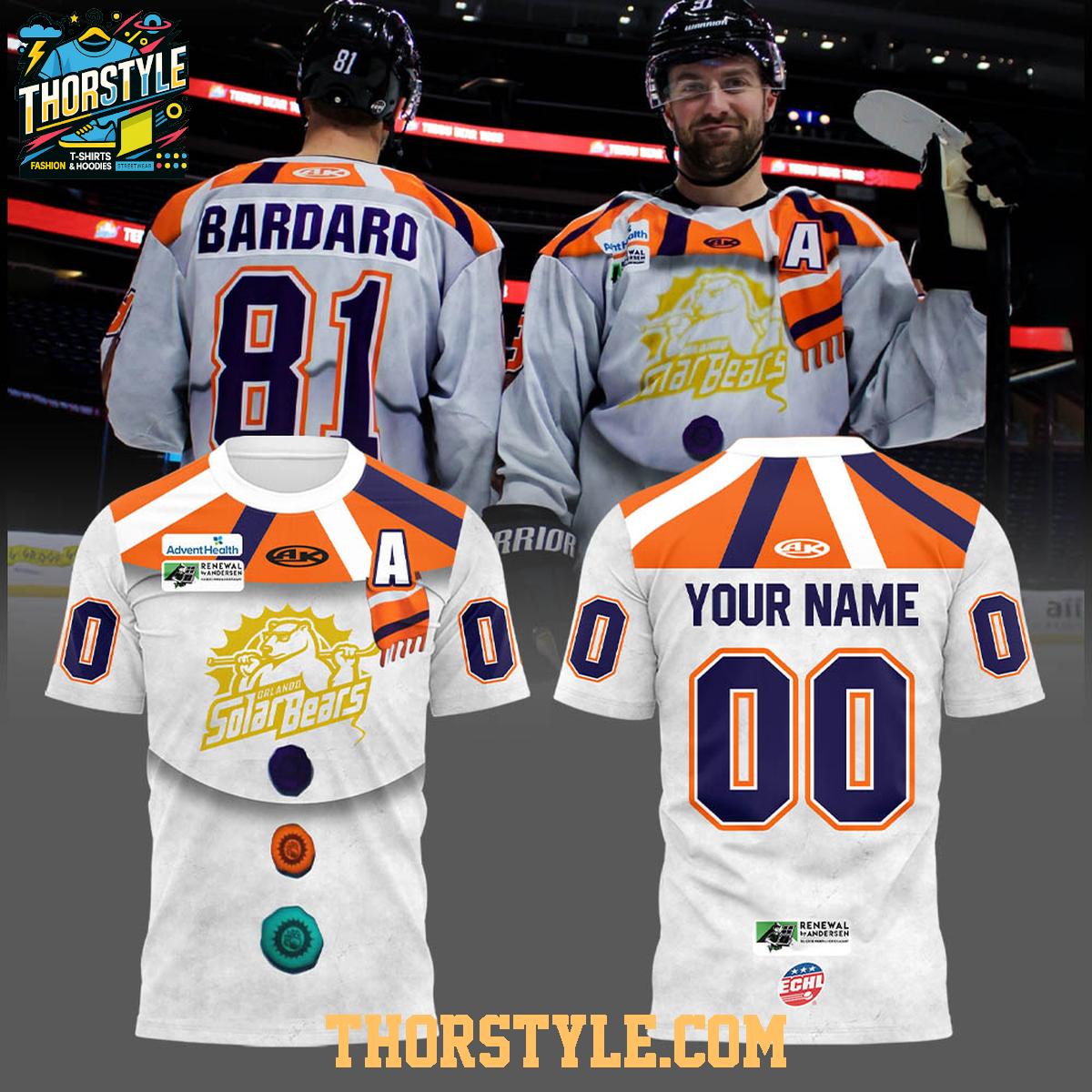 This hoodie t-shirt features a vibrant, eye-catching design. The front displays the iconic Solar Bears logo with a playful snowman theme, incorporating elements like "buttons" and a scarf. The back mimics a team jersey, complete with space for a personalized name and number, so you can feel like part of the team. The color scheme is a mix of team colors, making it instantly recognizable to fellow fans.