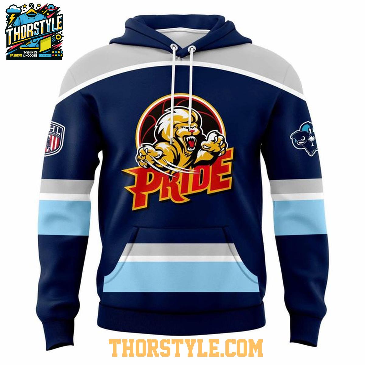 Celebrate the Pee Dee IceCats' Pride Night 2026 with this commemorative Hoodie T-Shirt, a unique garment that seamlessly blends the comfort of a classic tee with the stylish flair of a hoodie. This versatile piece is an ideal addition to any IceCats fan's wardrobe, allowing you to showcase your unwavering support for the team and the spirit of Pride in a comfortable and visually striking manner.
