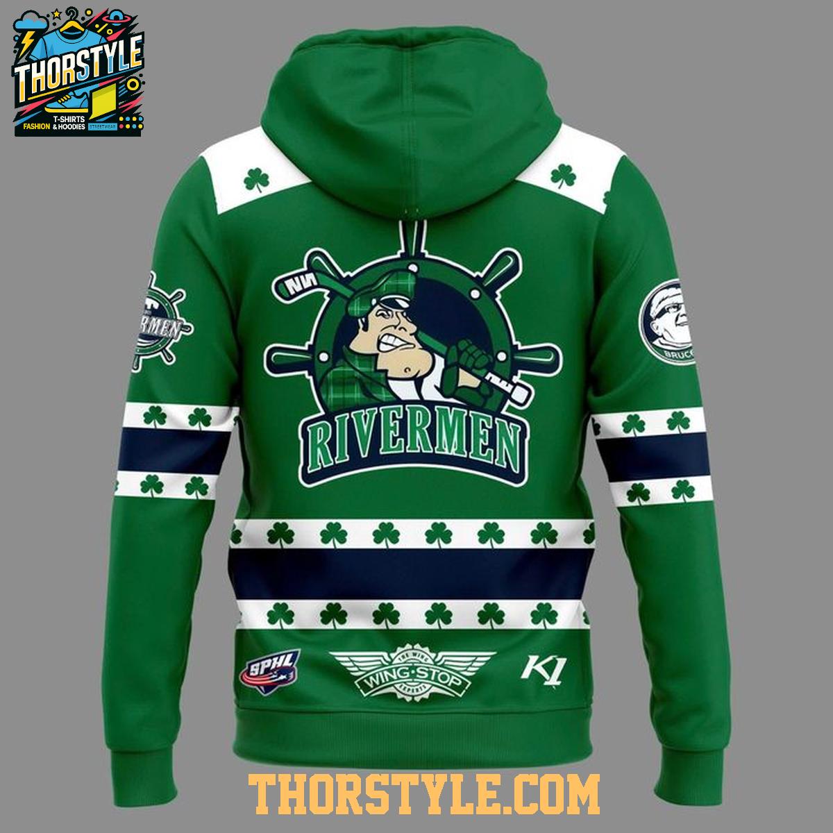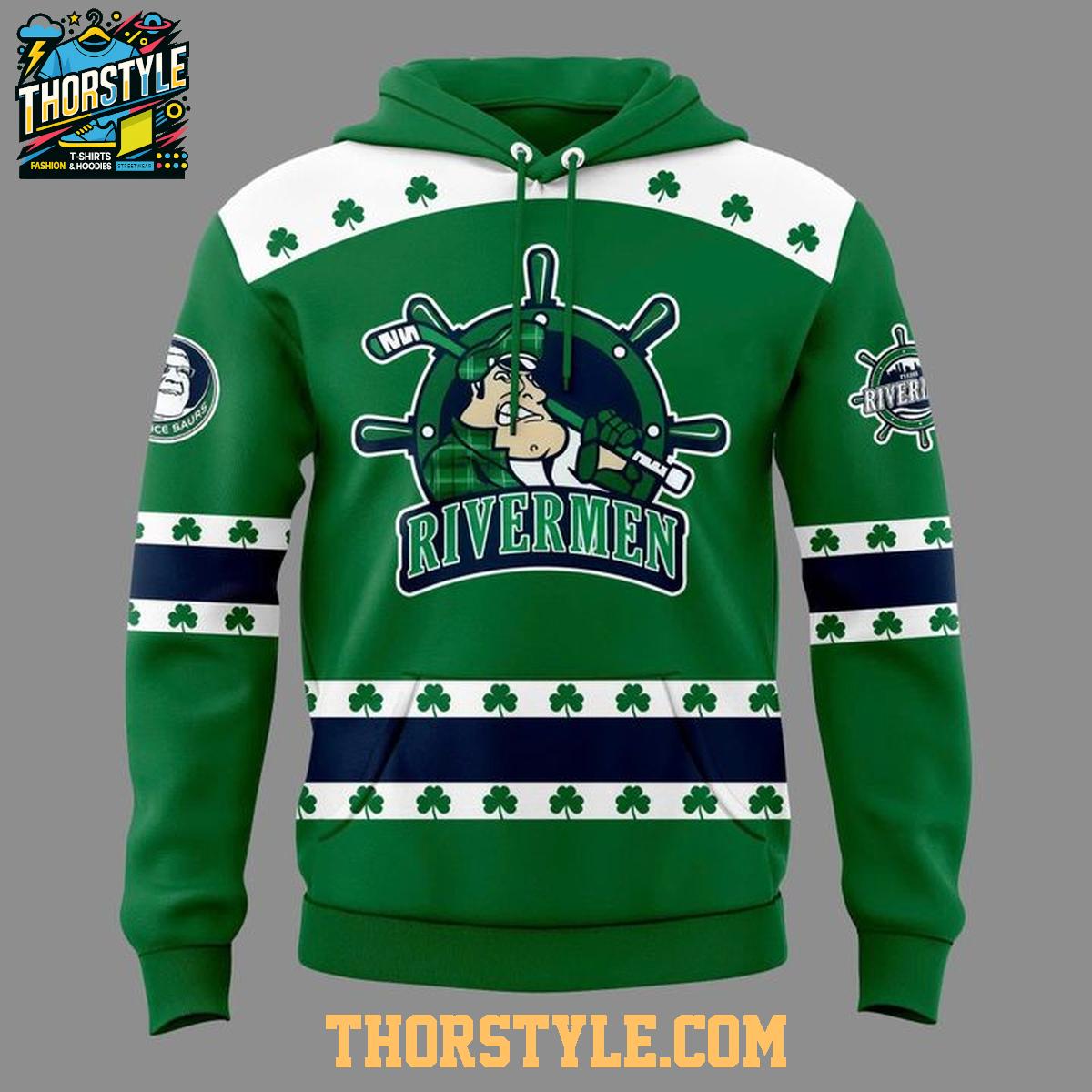 The hoodie t-shirt boasts a vibrant green base, beautifully embellished with the Rivermen's logo integrated with St. Patrick's Day-themed shamrocks and designs. Intricate graphics prominently display the team's emblem, reimagined with a festive twist appropriate for the holiday. The design extends across the chest and sleeves, delivering a bold and visually appealing look that is sure to turn heads.