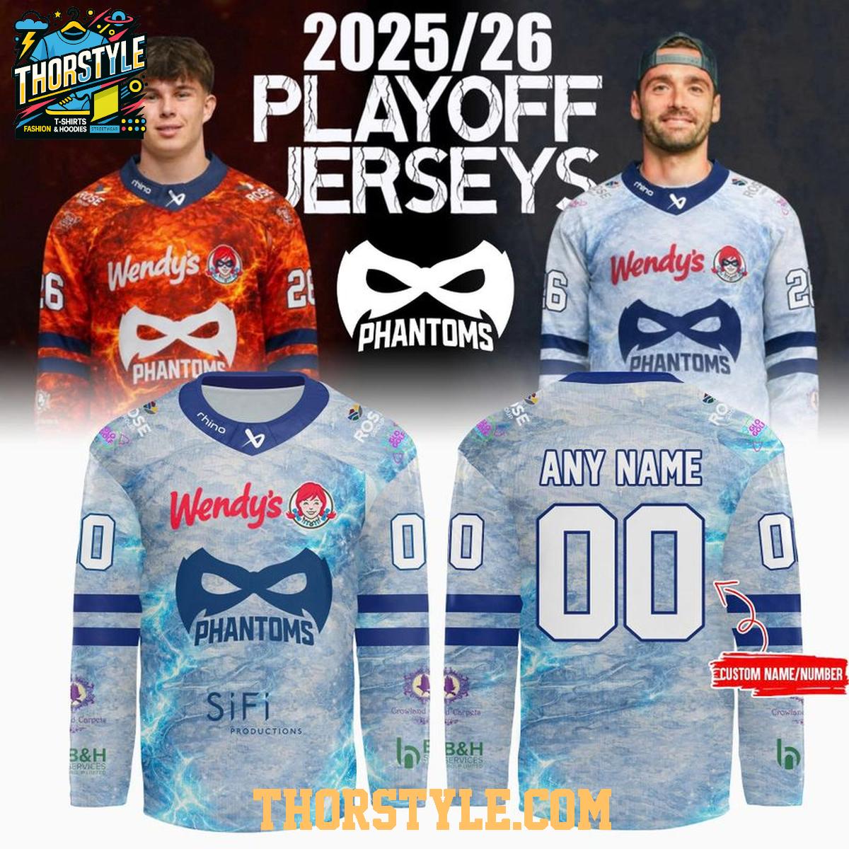 The jersey features the iconic Phantoms team logo prominently displayed on the front, along with sponsor branding that mirrors the authentic look of the jerseys worn by the players on the ice. The vibrant colors and sharp detailing capture the spirit of the team and the energy of the playoffs. The personalized touch comes with the option to add your own name and number to the back, making it a truly one-of-a-kind piece of fan gear.