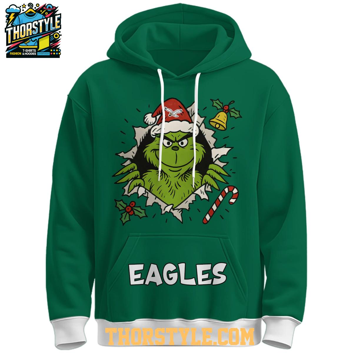 The design features a bold graphic incorporating the Grinch in a tongue-in-cheek manner, along with prominent Eagles branding. The front showcases a festive Grinch peeking through a torn graphic, complete with a Santa hat and holiday accessories. The back presents a cheeky twist, sure to elicit laughter and good-natured ribbing. The "Merry Kissmyass" message adds a final touch of playful defiance.