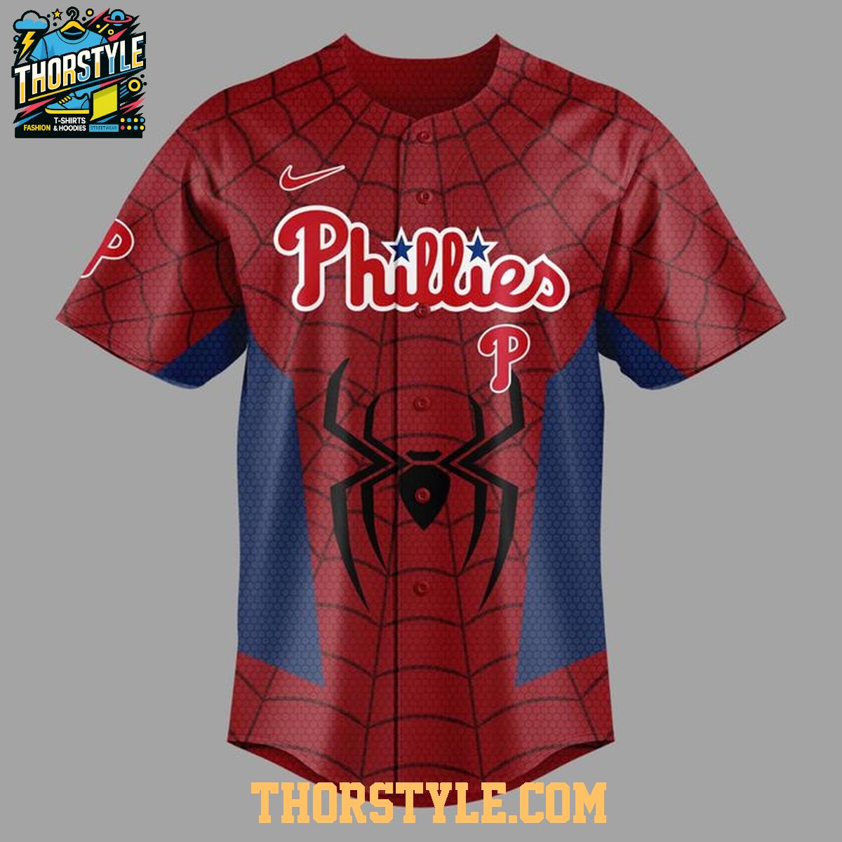 Imagine wearing this jersey to a Phillies game, turning heads and sparking conversations with fellow fans. Or, style it with jeans or shorts for a casual, everyday look that shows off your unique personality. Beyond game day, this jersey is a fantastic addition to any casual wardrobe, perfect for comic conventions, movie nights, or simply expressing your love for the Phillies and Spider-Man. To keep your jersey looking its best, machine wash cold and tumble dry low. This will help preserve the colors and prevent shrinking, ensuring that you can enjoy your Philadelphia Phillies Spider-Man jersey for years to come.