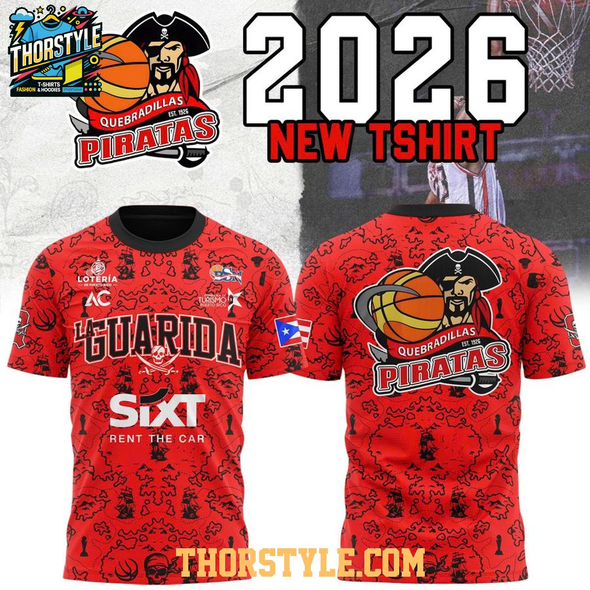 Show your unwavering support for the Piratas with the bold and vibrant Piratas de Quebradillas 2026 New Season Uniform Hoodie T-Shirt. This unique garment seamlessly blends the comfort of a t-shirt with the style and warmth of a hoodie, making it a versatile addition to any fan's wardrobe. It's more than just apparel; it's a statement of dedication to your favorite basketball team.