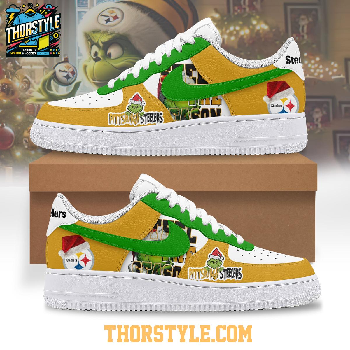 Embrace the festive yet defiantly spirited season with the Pittsburgh Steelers 2025 Grinch Hate Christmas Personalized Air Force 1 Shoes. This custom-designed footwear seamlessly integrates the iconic Nike Air Force 1 silhouette with a vibrant tribute to both passionate Steelers fandom and Dr. Seuss’s beloved holiday grump, creating a truly unique statement piece.