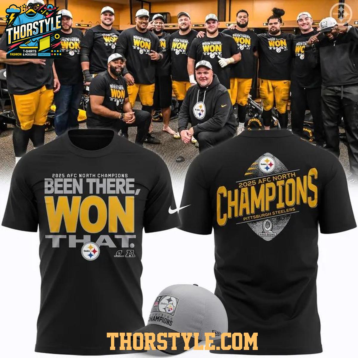 The design features bold, eye-catching graphics that celebrate the Steelers' AFC North Division Championship triumph. The front proudly displays the confident declaration "Been There, Won That" alongside the iconic Steelers logo, leaving no doubt about your team's winning spirit. The back boldly proclaims "2025 AFC North Champions," solidifying the team's dominance in the division. These high-quality prints are meticulously crafted to resist fading and cracking, ensuring that your championship pride remains vibrant for years to come.