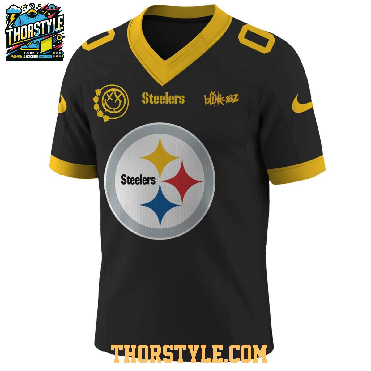 The design features vibrant colors and crisp, meticulously applied graphics that boldly showcase your unwavering passion for both the Steelers and Blink-182. The front of the jersey proudly displays the iconic Steelers logo alongside subtle, yet recognizable, Blink-182 inspired elements, creating a harmonious blend of both brands. The back of the jersey can be personalized with your chosen name and number, transforming it into a truly one-of-a-kind item that reflects your individuality. The contrasting trim adds a touch of sporty flair, perfectly complementing the overall design and completing the visually appealing look.