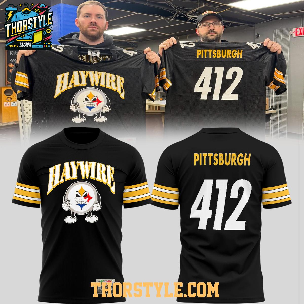This hoodie t-shirt features a bold "Haywire" graphic on the front, incorporating the iconic Steelers logo with a playful twist. The back displays "Pittsburgh" above the number "412," a nod to the city's area code. The sleeves are adorned with the classic Steelers gold and white stripes, providing a touch of vintage flair. It's a great way to show your love for Pittsburgh football.