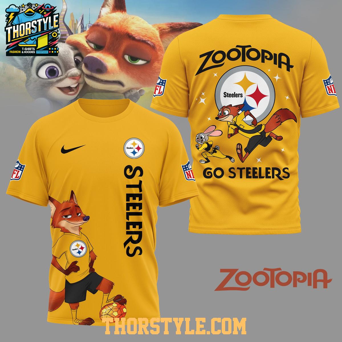 Featuring a creatively designed graphic, this hoodie t-shirt showcases beloved Zootopia characters playfully adorned in Steelers gear. The vibrant imagery presents a delightful fusion of the NFL team's iconic logo and colors with the animated movie's charm. This unique combination makes it a standout addition to any fan's wardrobe, perfect for showcasing your diverse interests and spirited personality.