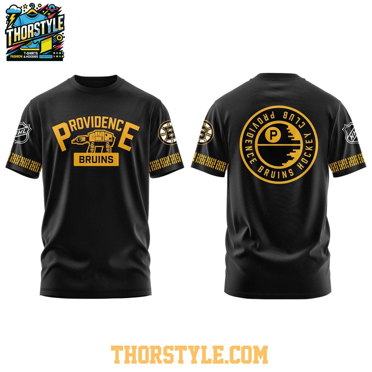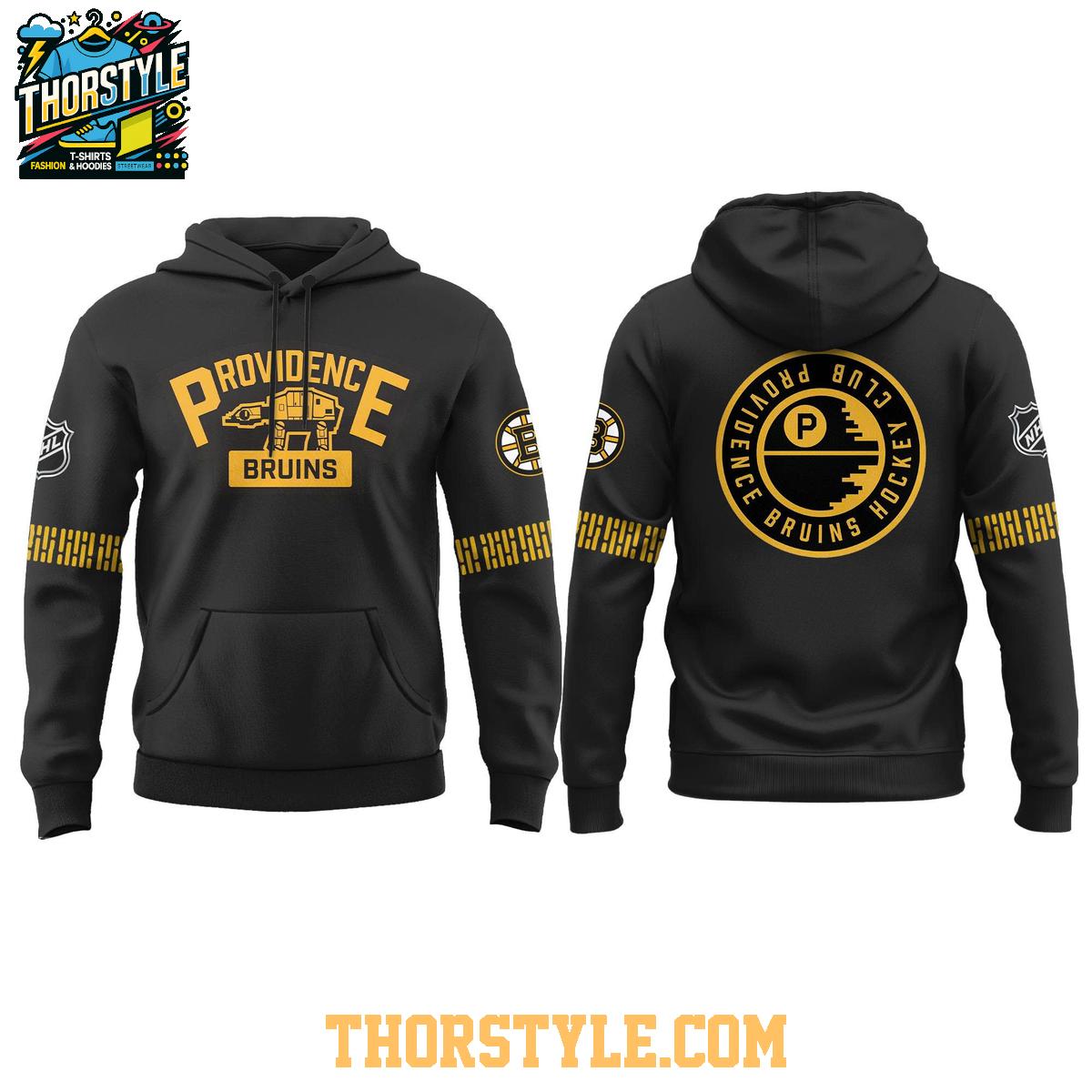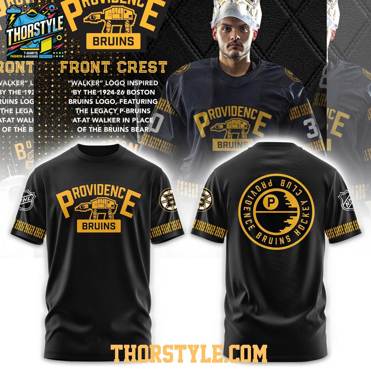 This hoodie t-shirt features a creative design that incorporates elements from both the Providence Bruins and the Star Wars saga. The front showcases a specially designed logo inspired by the 1924-26 Boston Bruins logo, featuring the legacy P-Bruins at-at walker in place of the Bruins bear. The back proudly displays the Providence Bruins hockey club logo, adding another layer of team pride. The black color provides a sleek and versatile backdrop for the vibrant graphics.