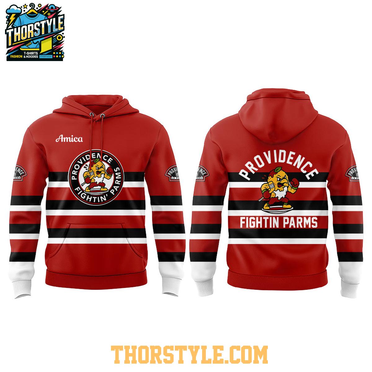 This hybrid hoodie t-shirt features the iconic "Fightin' Parms" logo prominently displayed, showcasing a fun and spirited design. The bold red and black stripes pay homage to the classic hockey jersey aesthetic. The overall design captures the energy and excitement of Providence Bruins hockey, making it a conversation starter wherever you go.
