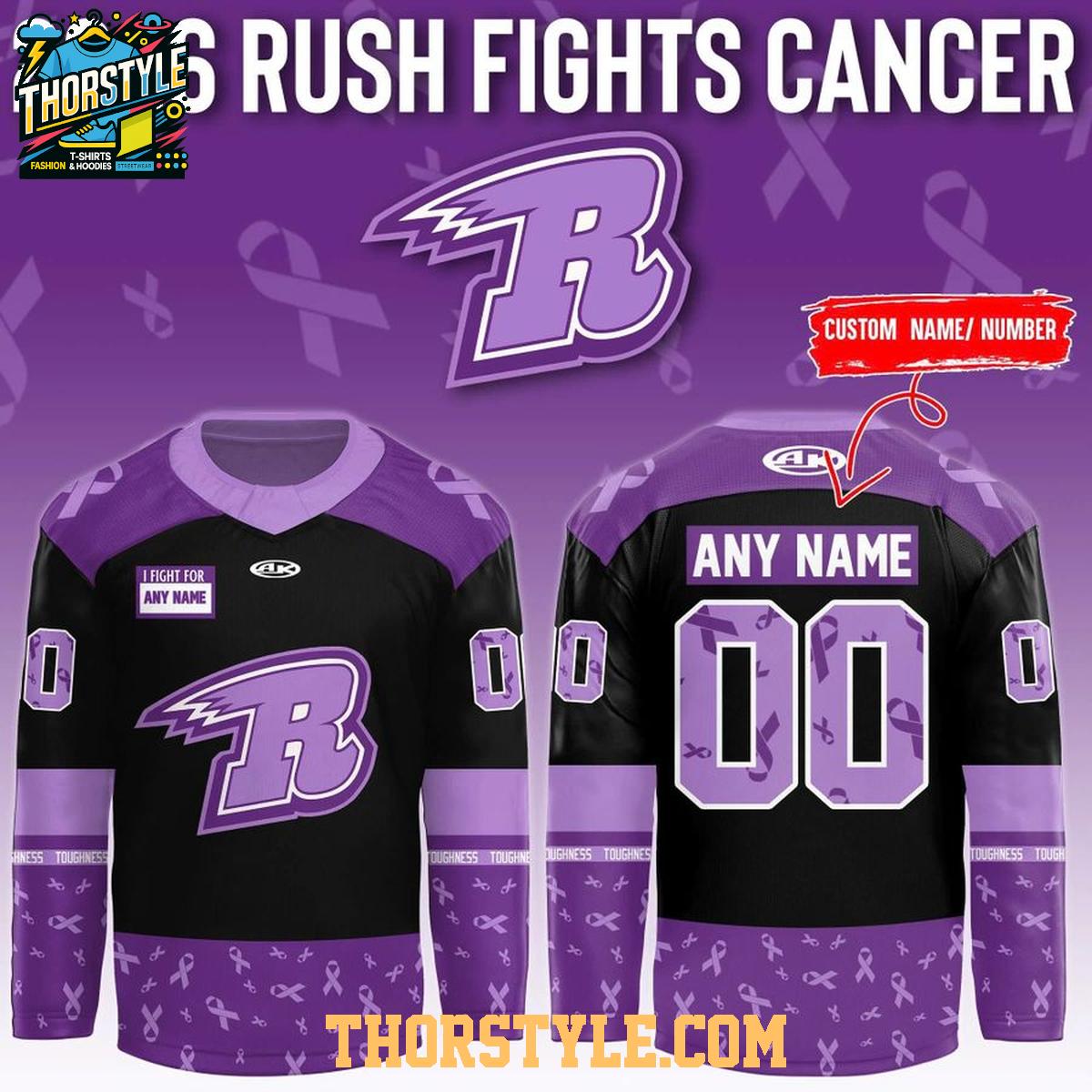 The unique design seamlessly incorporates the Rush team colors with a distinctive "Fights Cancer" theme, prominently featuring symbolic ribbon accents. Further enhancing its significance, you have the option to personalize the jersey with your name and preferred number, adding a personal touch that makes it a truly one-of-a-kind item. This personalization ensures that your jersey reflects your individual support for the Rush and your identity as a dedicated fan.