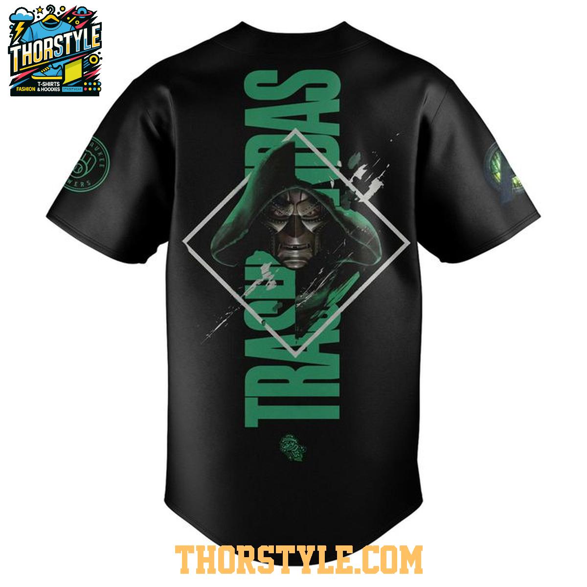 Show your dual allegiance to baseball and the Marvel Universe with the limited-edition Rocket City Trash Pandas Avengers Doomsday 2026 Night Baseball Jersey. This unique piece of fan apparel seamlessly blends the excitement of America's favorite sport with the captivating world of superheroes, creating a statement piece for dedicated followers of both. The design incorporates imagery inspired by Doctor Doom.