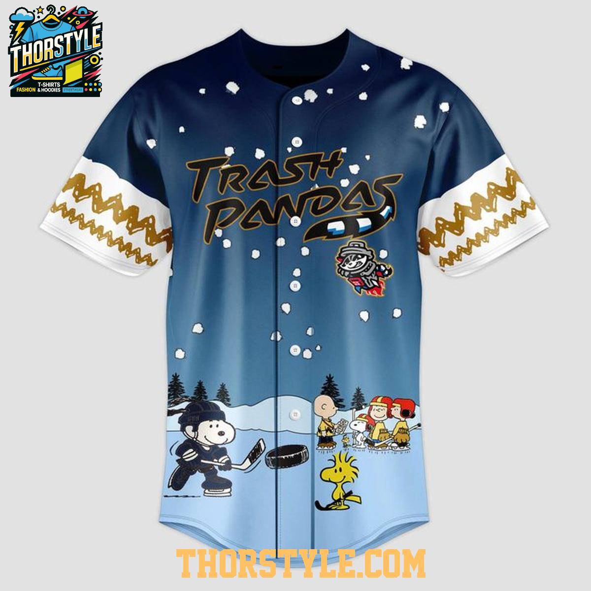 This special edition baseball jersey features a vibrant design incorporating both the Trash Pandas logo and iconic Peanuts characters engaging in winter activities. The playful imagery is printed with high-quality, durable inks to ensure the graphics remain crisp and clear, even after repeated wear and washing. The jersey itself is crafted from a breathable, lightweight fabric, designed to keep you comfortable whether you're cheering from the stands or sporting it around town.