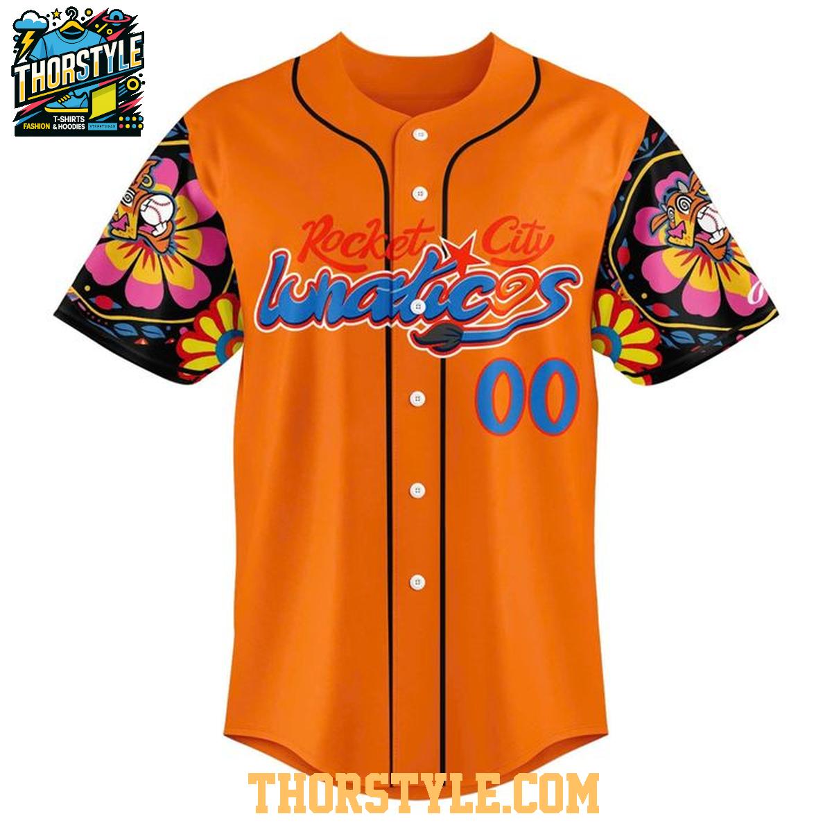 Crafted from breathable and lightweight fabric, this baseball jersey ensures optimal comfort whether you're enthusiastically cheering from the stands, participating in a casual game of catch, or simply enjoying a warm day outdoors. The eye-catching bright orange color immediately draws attention, while the prominent "Rocket City Lunaticos" logo emblazoned across the chest clearly communicates your unwavering team allegiance. The sleeves are adorned with a distinctive pattern, adding a touch of flair and individuality that distinguishes this jersey from standard fan apparel.