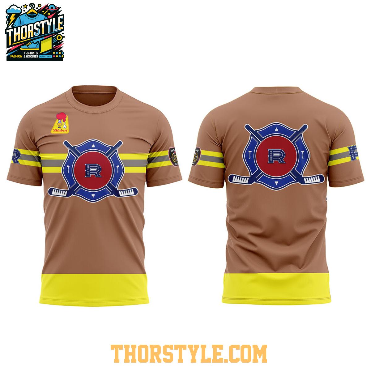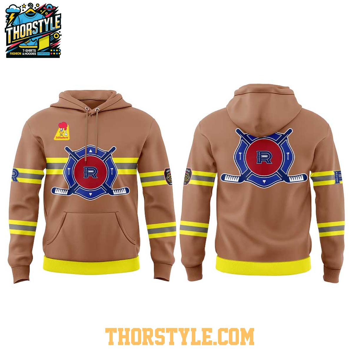 The design features a visually striking firefighter-themed graphic that cleverly incorporates the iconic Rocket de Laval hockey team's emblem. The bold, eye-catching colors and meticulously detailed artwork create a visually appealing piece that is sure to stand out from the crowd and spark conversation. The integrated hoodie design adds an extra layer of warmth and undeniable style, making it the perfect choice for cooler days or evenings.