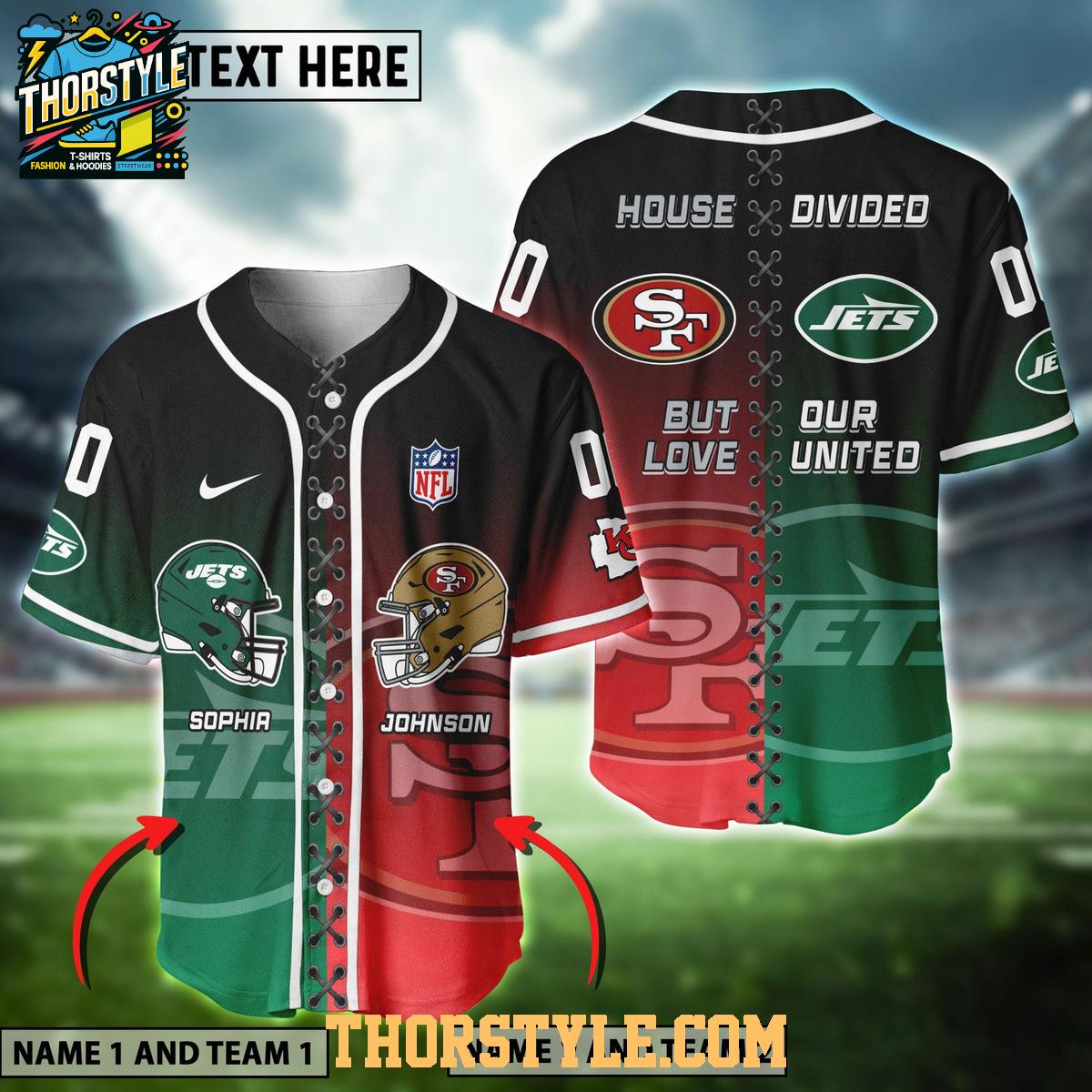 Showcase your unique NFL fandom with the San Francisco 49ers New York Jets Love United 2025 Personalized Baseball Jersey. This distinctive jersey merges the iconic imagery of two powerhouse football teams into a single, eye-catching design, celebrating a shared love for the game. It's a perfect way to represent a "house divided" with a message of unity.