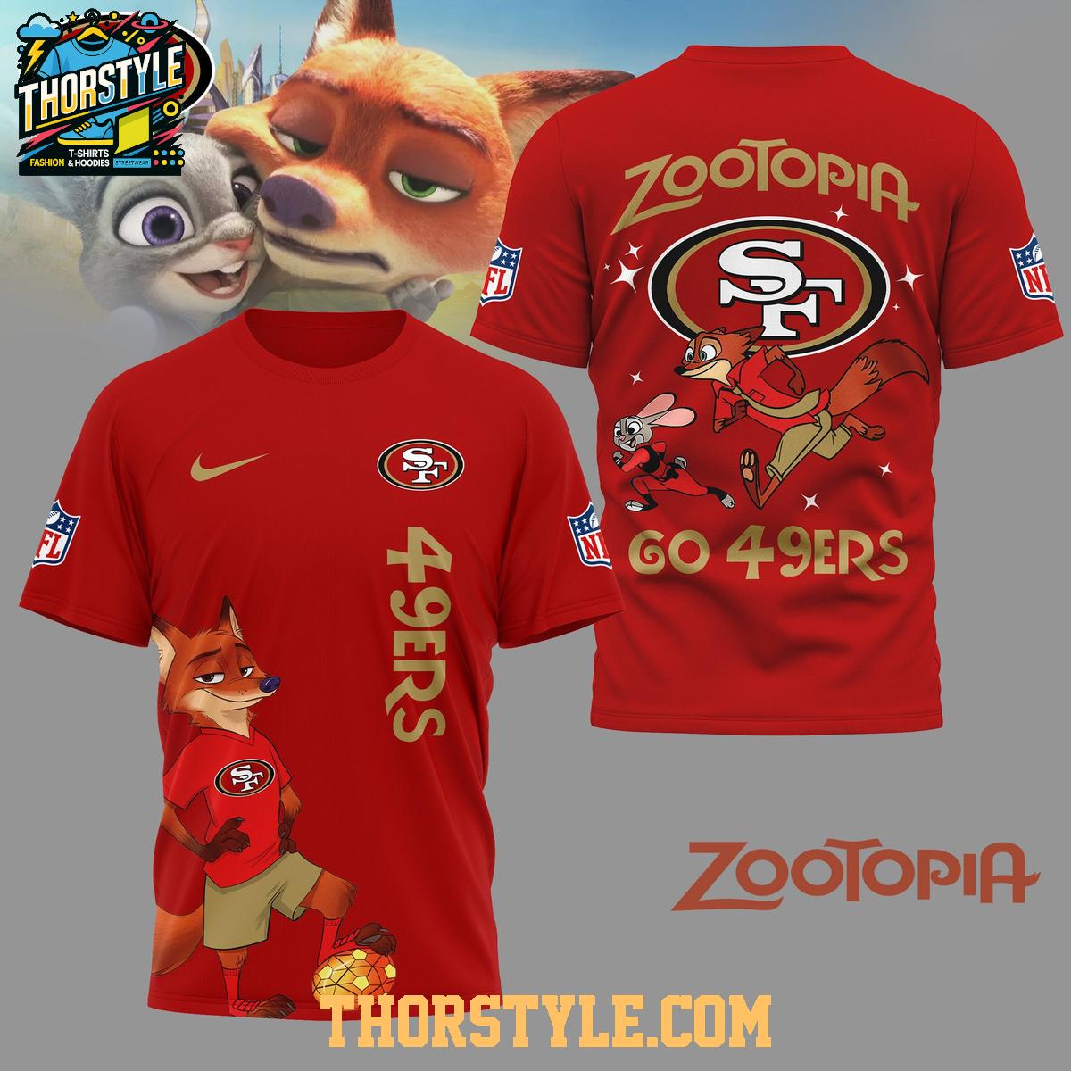 The high-quality print ensures that the intricate details and vibrant colors of the design remain sharp and vivid, even after repeated washing. To maintain the garment's pristine condition, machine wash it inside out in cold water and tumble dry on low. This San Francisco 49ers Zootopia NFL crossover apparel is a fantastic way to showcase your unwavering passion for the Niners and your appreciation for creative and imaginative designs. Wear it with pride and let your unique fandom shine through.