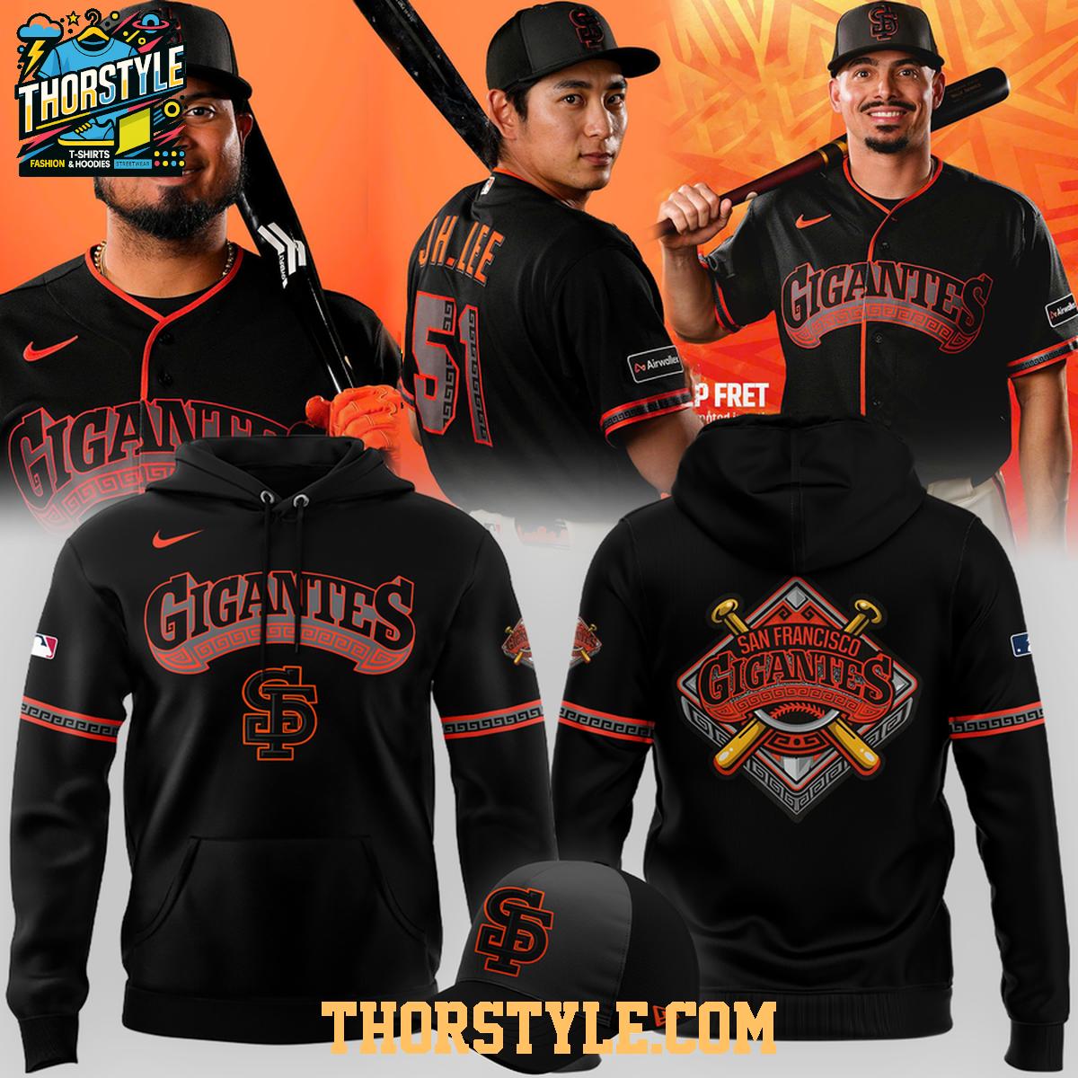 The hoodie's design prominently features the bold "Gigantes" lettering across the chest, a direct nod to the team's Spanish name and a symbol of unity. Accompanying the lettering is a specially designed emblem celebrating the city of San Francisco, seamlessly integrating cultural elements that create a visually striking and meaningful tribute to the Latin American influence on the team and the community. The back of the hoodie showcases a unique graphic, artfully blending classic baseball imagery with details symbolic of Latin heritage, creating a cohesive and eye-catching design.
