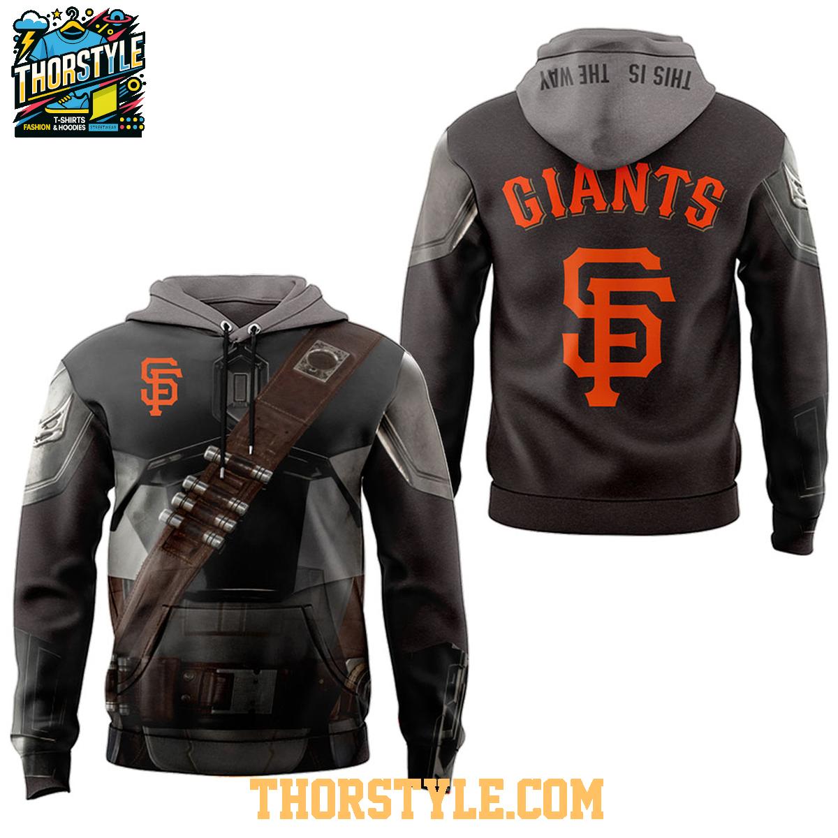 The design features a detailed graphic print that mimics the look of Mandalorian armor on the front, complete with the Giants logo subtly integrated. The back proudly displays "Giants" above a larger team logo. A special detail is added to the hood, featuring the inscription "This Is The Way," completing the Star Wars theme. The hoodie is made from a comfortable, breathable fabric blend, ideal for staying warm during those cooler evenings at Oracle Park or while simply lounging at home.