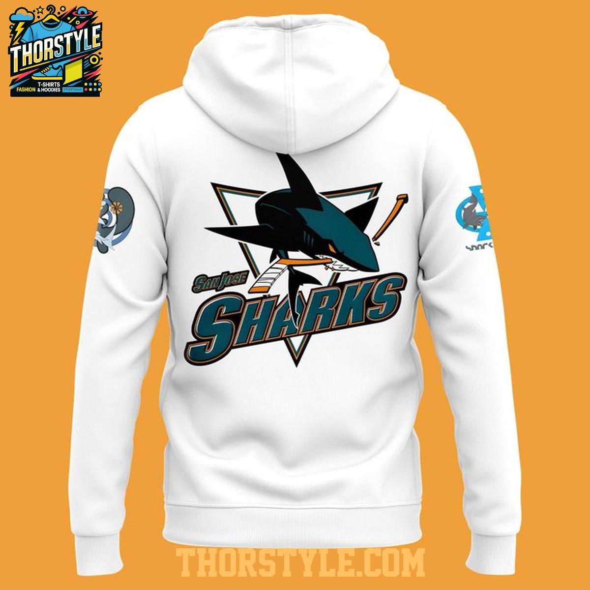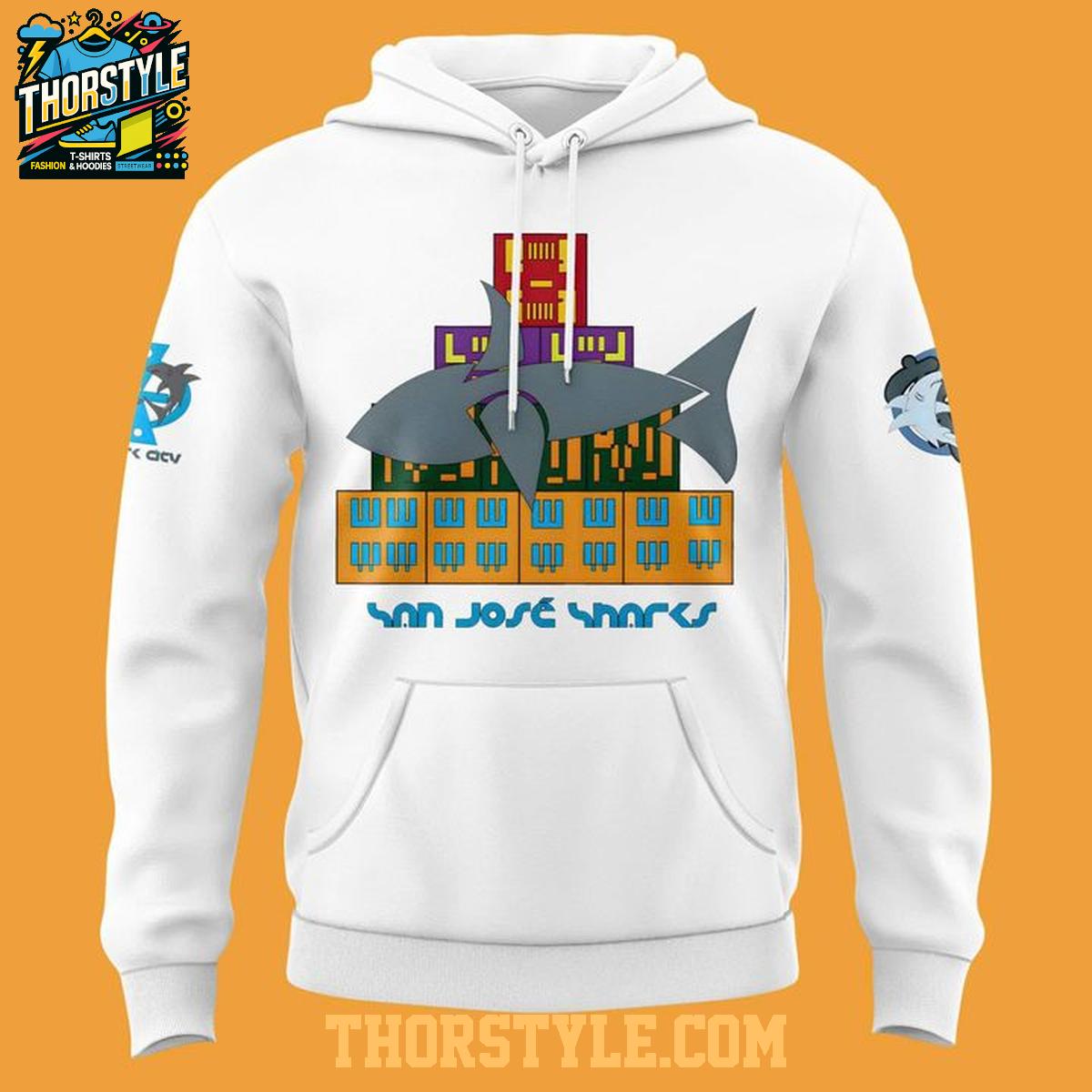 This hoodie t-shirt features a distinctive design that honors Black Excellence and your favorite hockey team. The front showcases a stylized depiction of the San Jose skyline with the iconic Sharks logo integrated into the cityscape. The back prominently displays the team name and logo, ensuring your allegiance is clear from all angles. The sleeves feature smaller, complementary graphics, tying the whole design together.
