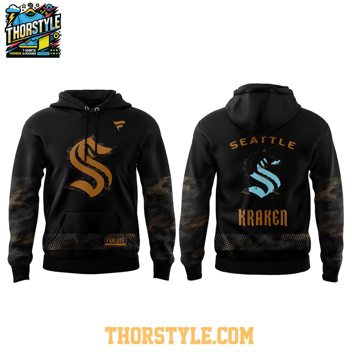 Embodying both team pride and patriotic honor, the Seattle Kraken Military Appreciation Night 2025 Salute Hoodie T-Shirt stands as a distinguished item in any fan's collection. It is a declaration of support, a badge of honor, and a continuous salute to the courage and dedication that define both the Kraken spirit and the heart of our military.