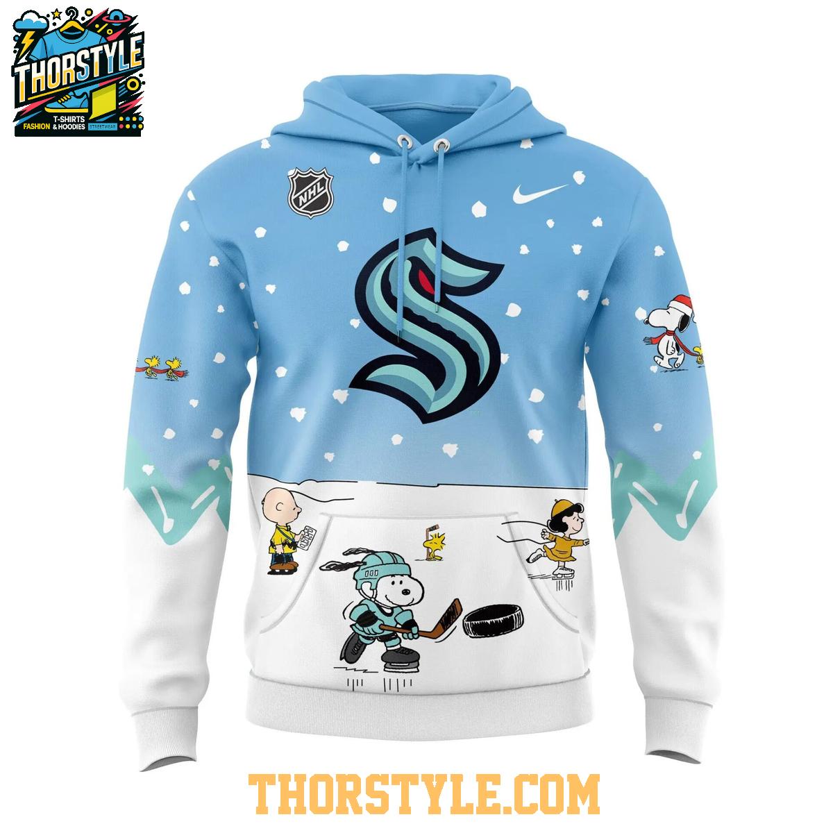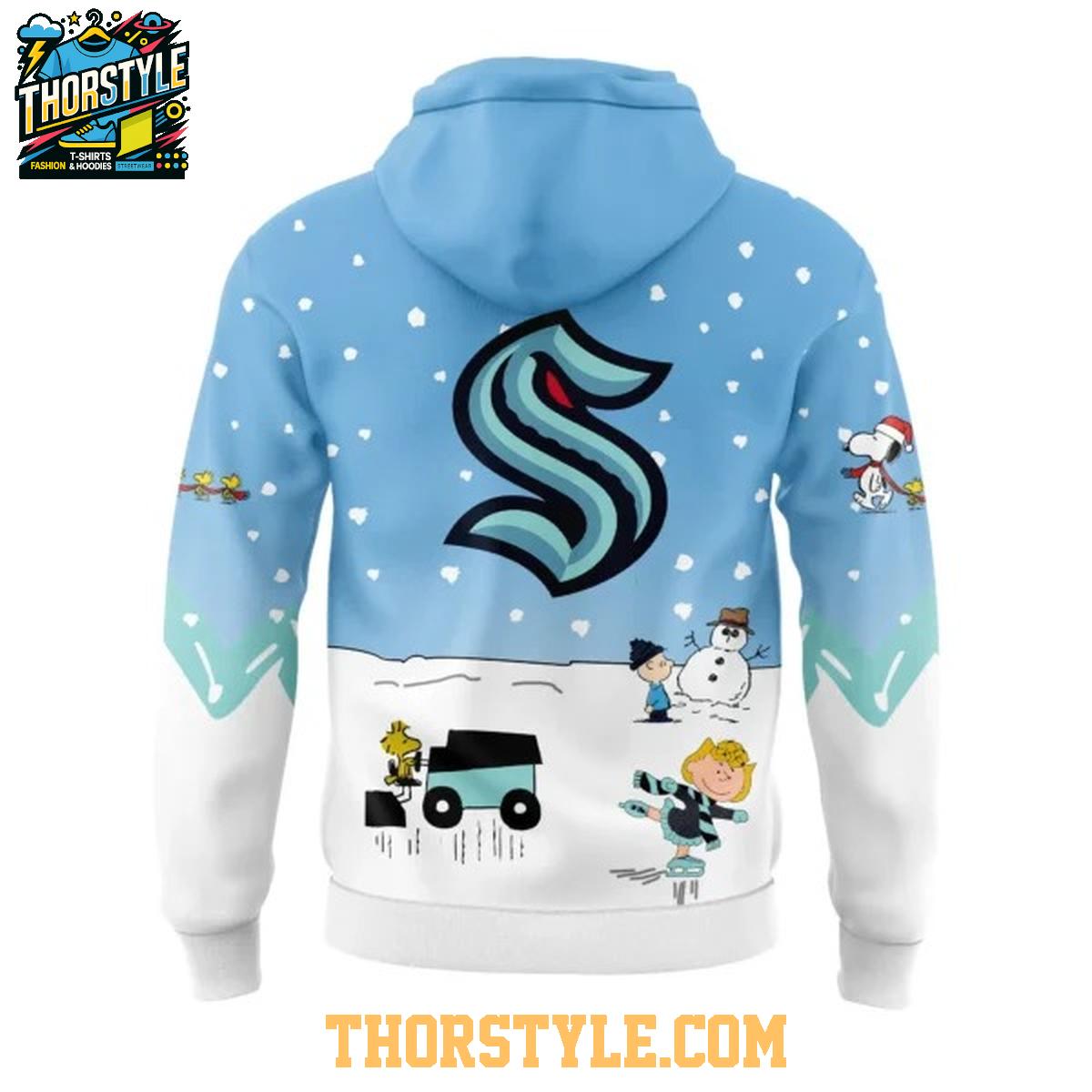 The design features classic Peanuts characters, including Snoopy joyfully playing hockey, all while incorporating the iconic Seattle Kraken "S" logo. A snowy Christmas theme ties the design together, creating a delightful visual that embodies both holiday cheer and hockey enthusiasm. This hoodie is perfect for wearing to holiday gatherings, showing your team pride at winter games, or simply enjoying a cozy day indoors.