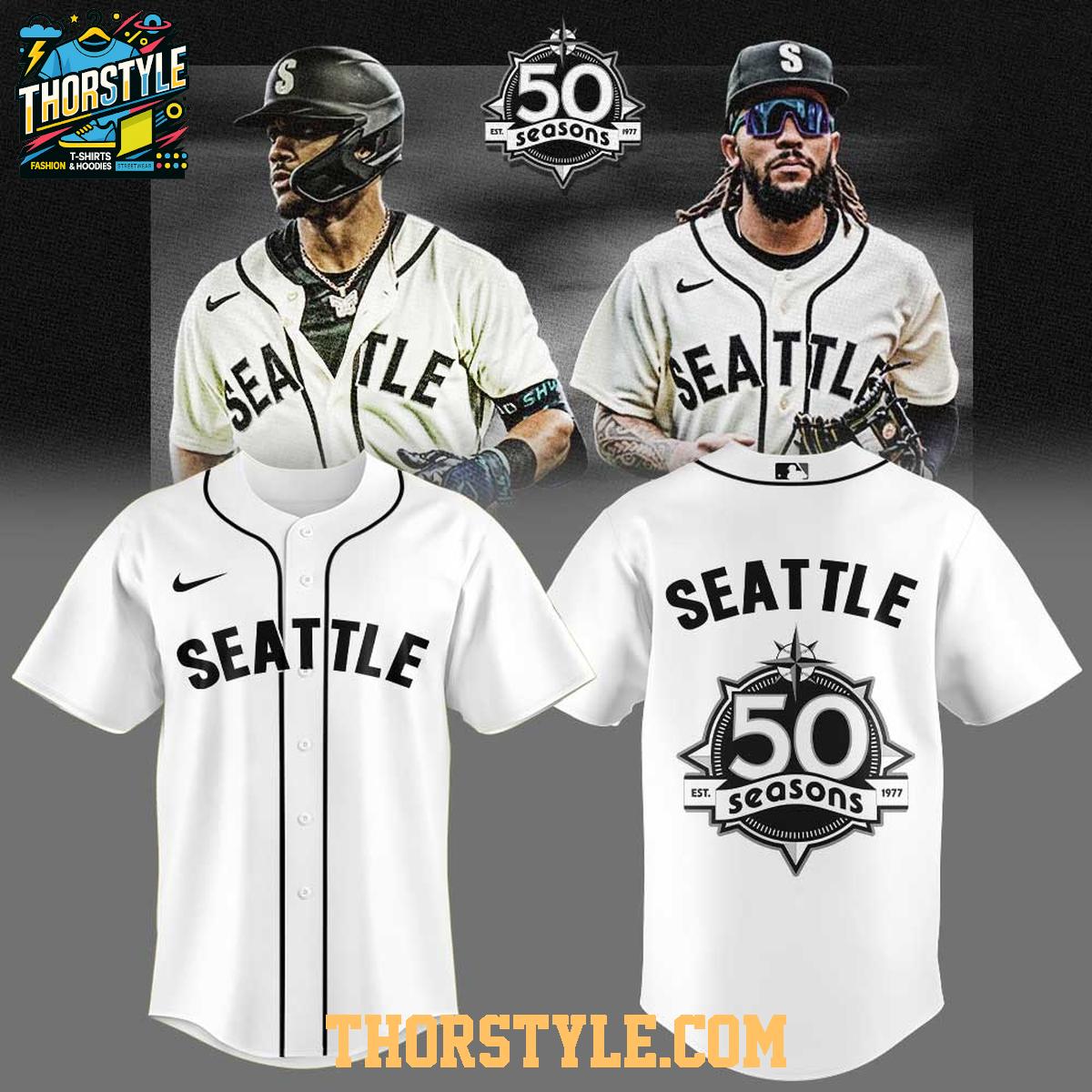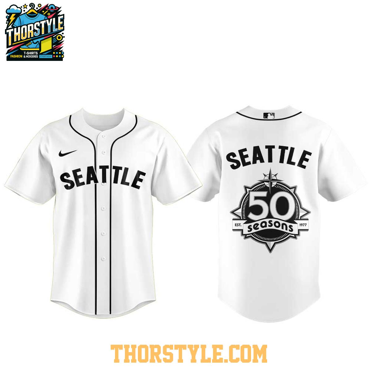 Featuring the iconic "Seattle" lettering across the chest, this baseball jersey also sports a special commemorative patch on the back, celebrating 50 seasons (Est. 1977). The design is clean and classic, making it incredibly versatile. Pair it with jeans and sneakers for a relaxed, everyday look, or dress it up with khakis for a slightly more polished style. It's a fantastic conversation starter and a way to connect with fellow baseball enthusiasts.