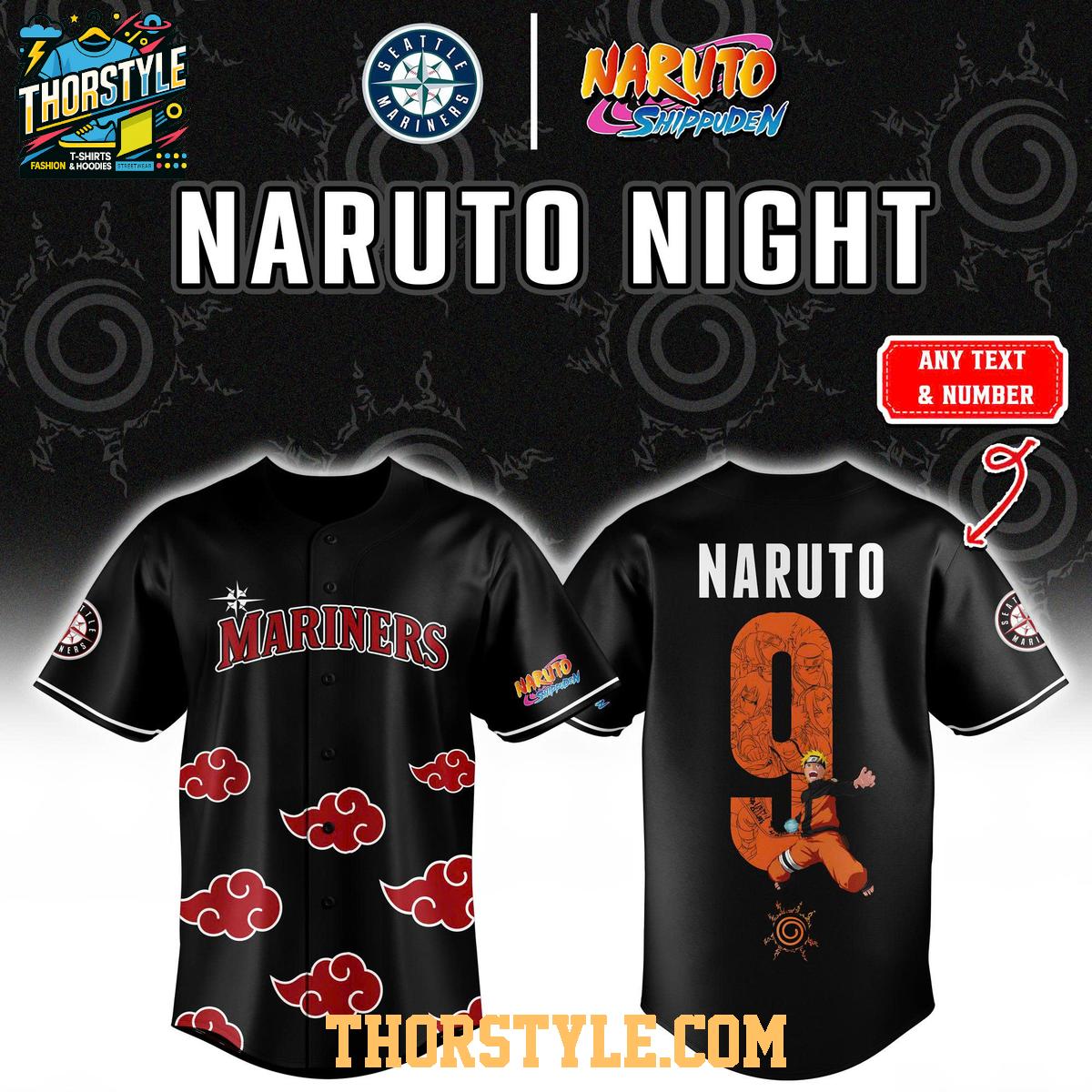 The jersey features a bold design that incorporates elements from both the Seattle Mariners and Naruto Shippuden. On the front, you'll find the "Mariners" logo emblazoned across the chest, while Akatsuki cloud designs are patterned throughout. The back showcases "Naruto" above a large number 9 graphic filled with images from the series, celebrating Naruto's Nine-Tails form. This fusion of styles creates a truly unique and memorable piece of apparel.