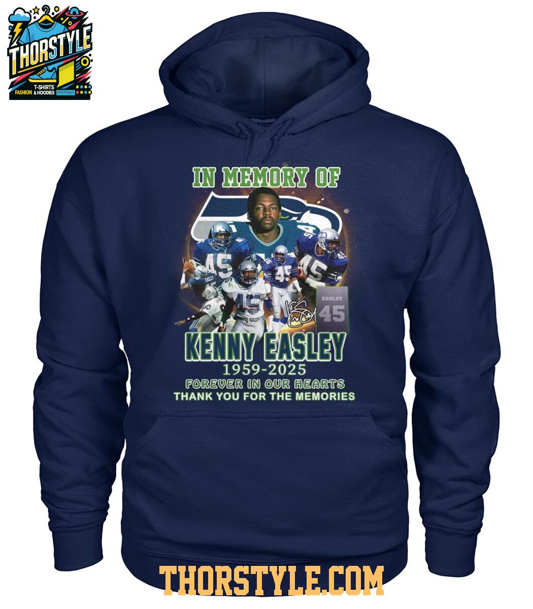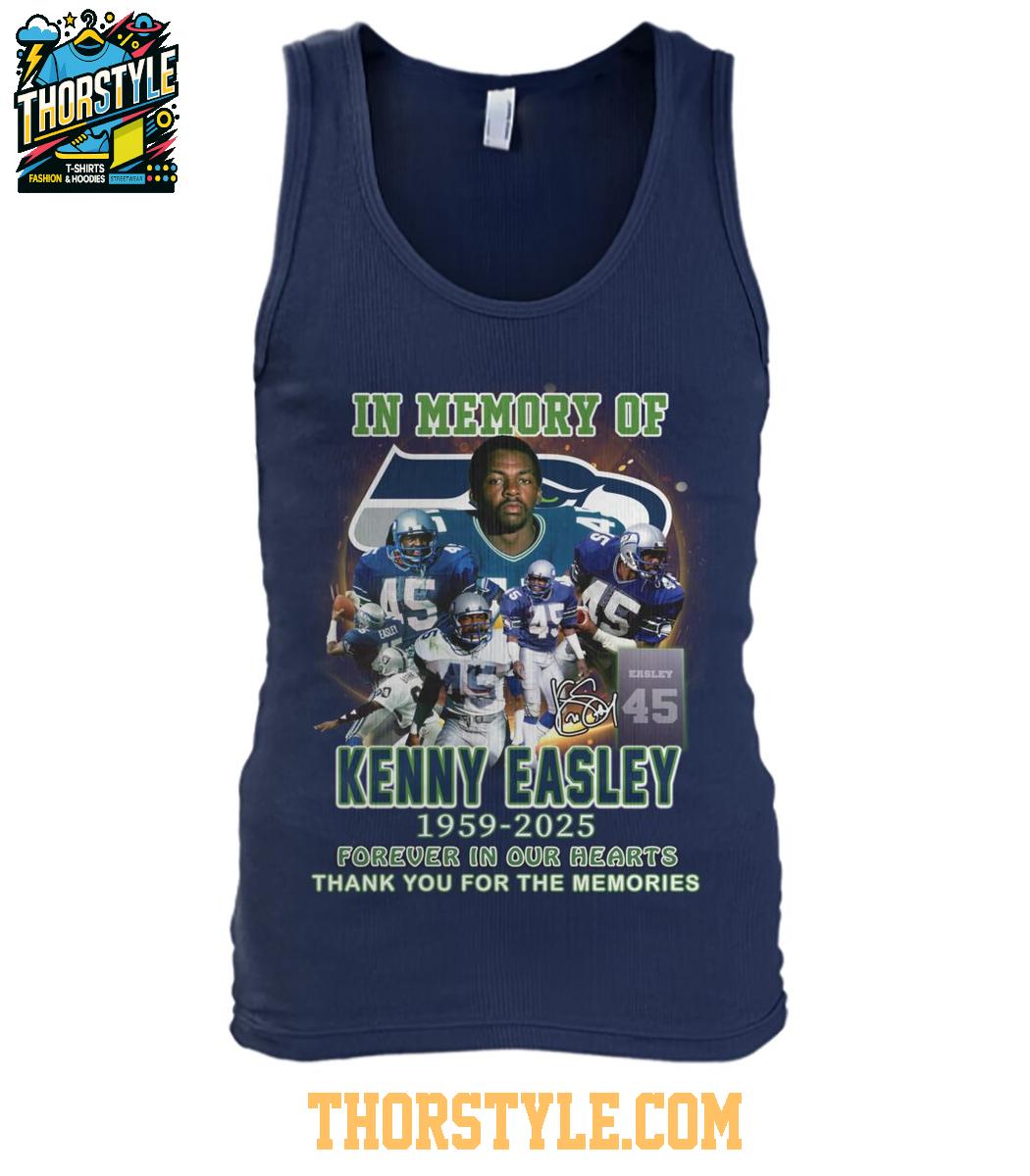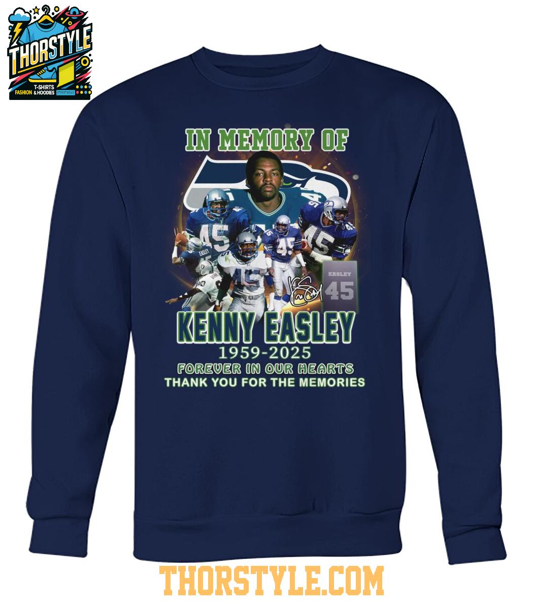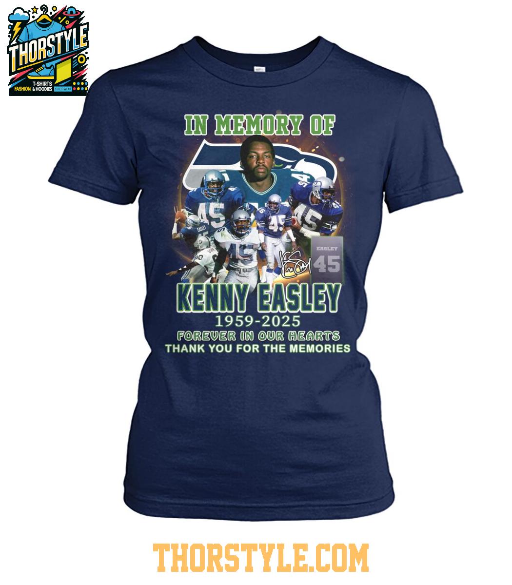 The t-shirt features a vibrant graphic that showcases Easley in action, proudly sporting his iconic #45 jersey. The design incorporates a dynamic collage of images that capture memorable moments from his playing days, allowing fans to relive the excitement and passion he brought to the game. Above the images, the inscription "In Memory Of Kenny Easley 1959-2025" is prominently displayed, accompanied by the touching sentiment "Forever in our hearts, Thank you for the memories."