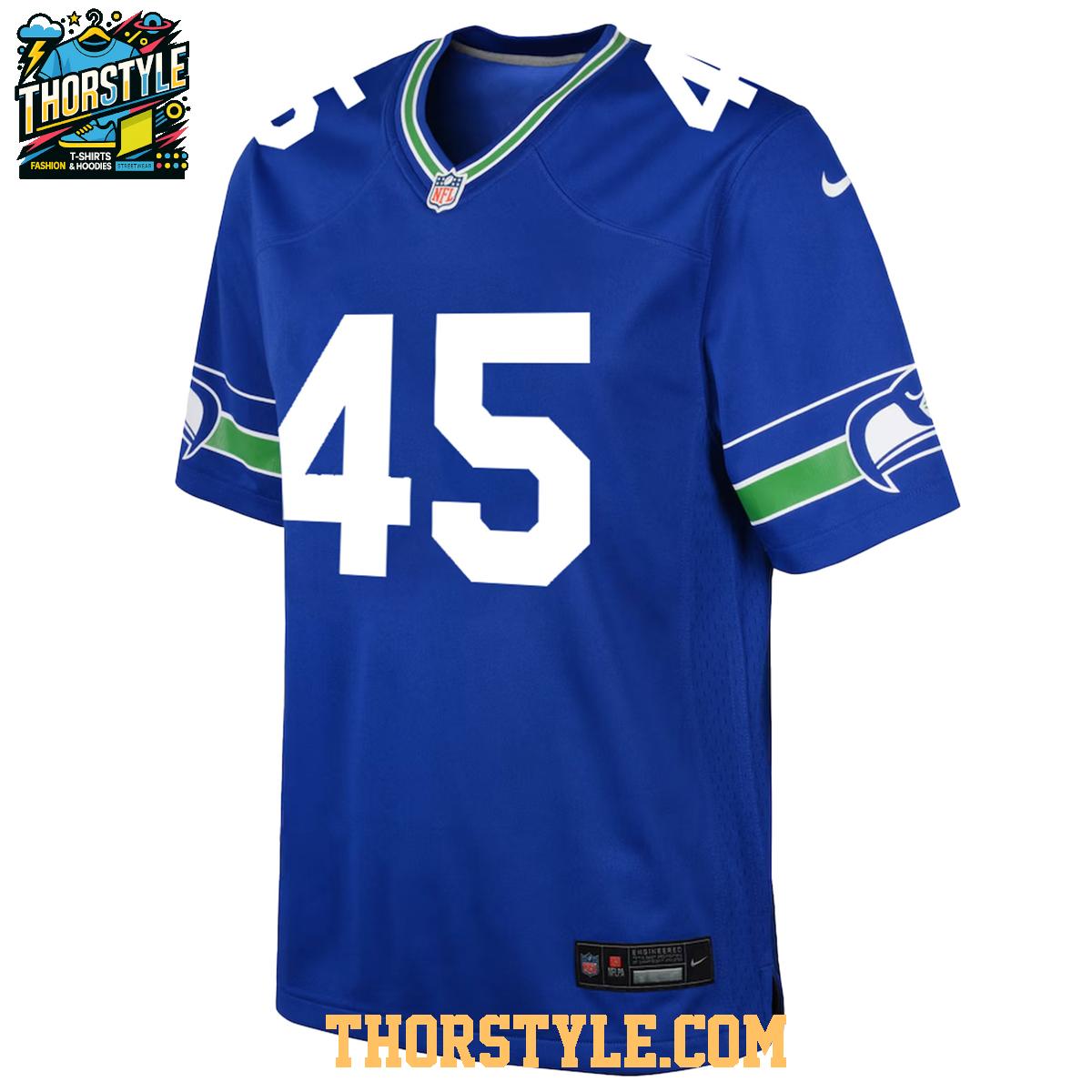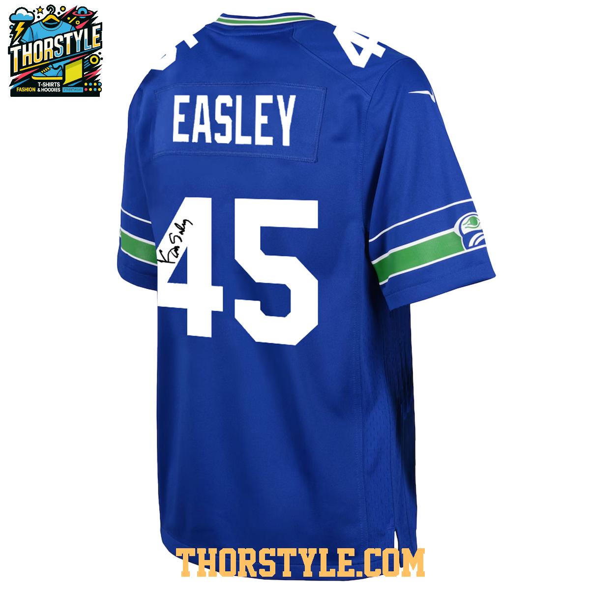 The vibrant royal blue jersey proudly displays Easley's iconic number 45 on both the front and back, ensuring immediate recognition and a connection to his playing days. The classic Seahawks logo is prominently featured on the sleeves, complete with the team's distinctive green accents, maintaining an authentic aesthetic. Above the number on the back, the "EASLEY" nameplate is boldly stitched, further solidifying the jersey's representation of this legendary player.