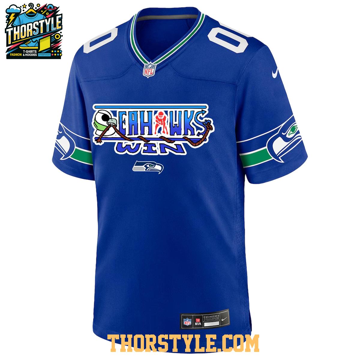 Crafted from breathable, high-quality materials, this jersey is designed for comfort and durability. The fabric wicks away moisture, keeping you cool and dry whether you're cheering from the stands or playing a pickup game with friends. The detailed stitching and vibrant colors ensure that the Seahawks logo, the One Piece-inspired graphics, and your personalized name and number will stand out. It's built to withstand regular wear and tear, maintaining its look season after season.