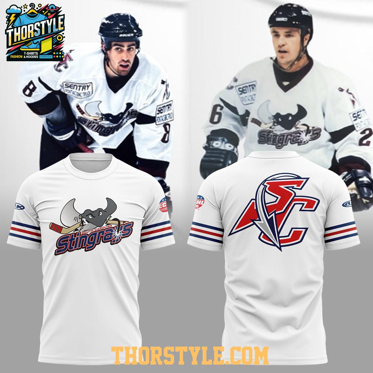 The front of the hoodie t-shirt proudly displays the iconic Stingrays logo, instantly recognizable to fellow enthusiasts and a symbol of your allegiance. The carefully crafted throwback design commemorates a significant period in the team's history, serving as a fantastic conversation starter and a way to connect with other long-time supporters who share your passion. Stripes in the team's vibrant colors adorn the sleeves, further enhancing the vintage aesthetic and adding a touch of nostalgic flair. Completing the design, the secondary team emblem is prominently featured on the back, ensuring your team spirit is visible from all angles.